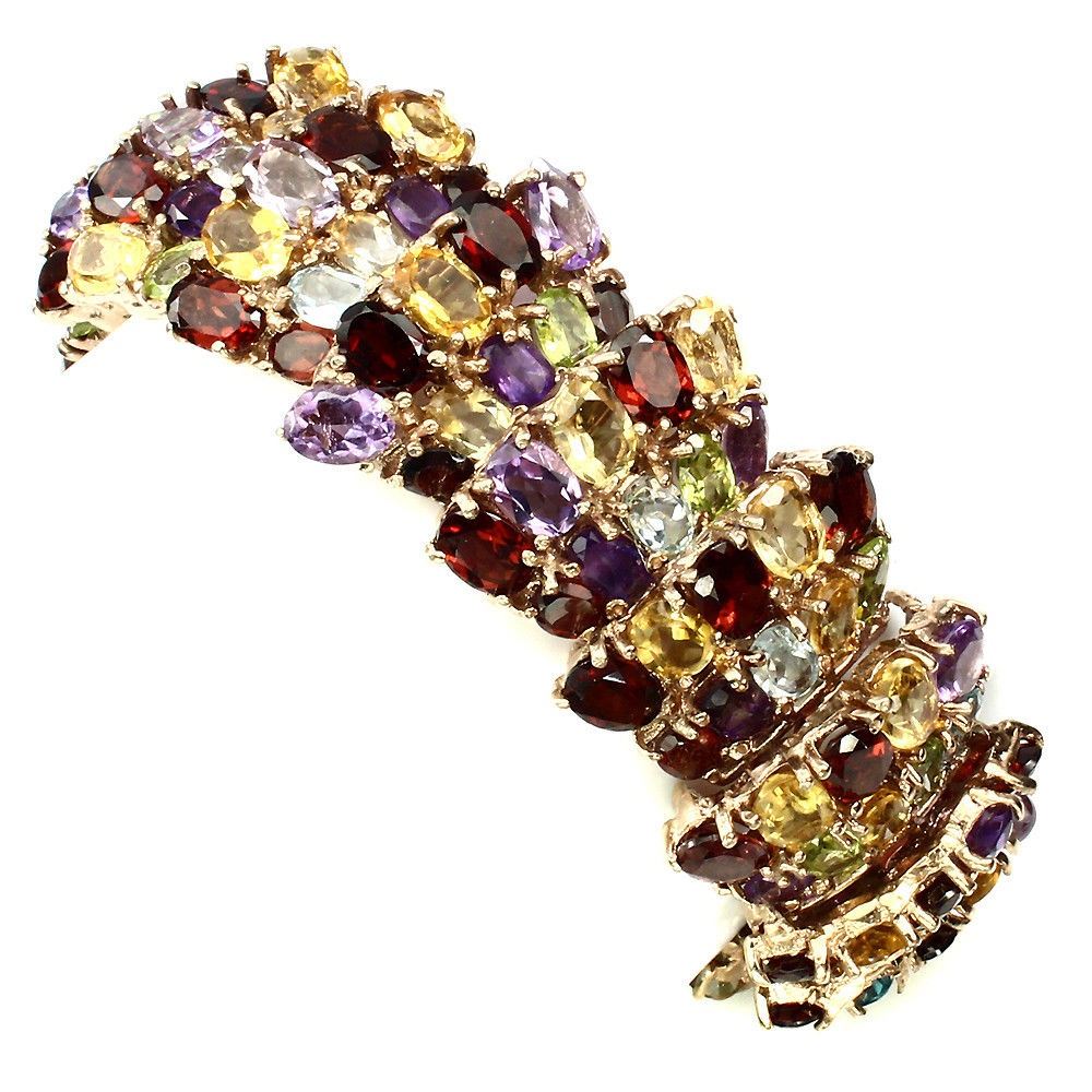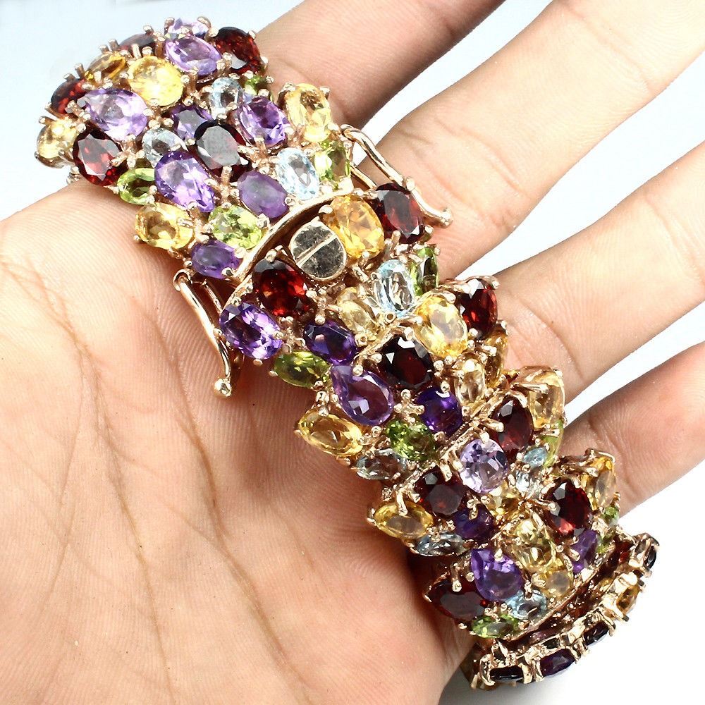 925 STERLING SILVER;PLATE.....14K ROSE GOLD;LENGTH (INCHES)8.5; Gems-AMETHYST,CITRINE,MOZAMBIQUE GARNET,PERIDOT,SKY BLUE TOPAZ;TOTAL WEIGHT447.57 CT (TOTAL WEIGHT OF SILVER + STONE)DIMENSION* STONE 6.0 X 4.0 TO 8.0 X 6.0 MM. * FACE BRACELET 210.0 X 26.0 MM.MAIN STONE SHAPEOVAL CUTMAIN STONE COLORTOP RICH PURPLECLARITY/GRADEIF TO VVSLUSTERSTUNNINGTREATMENTUNHEATEDORIGINBRAZILHARDNESS7.0