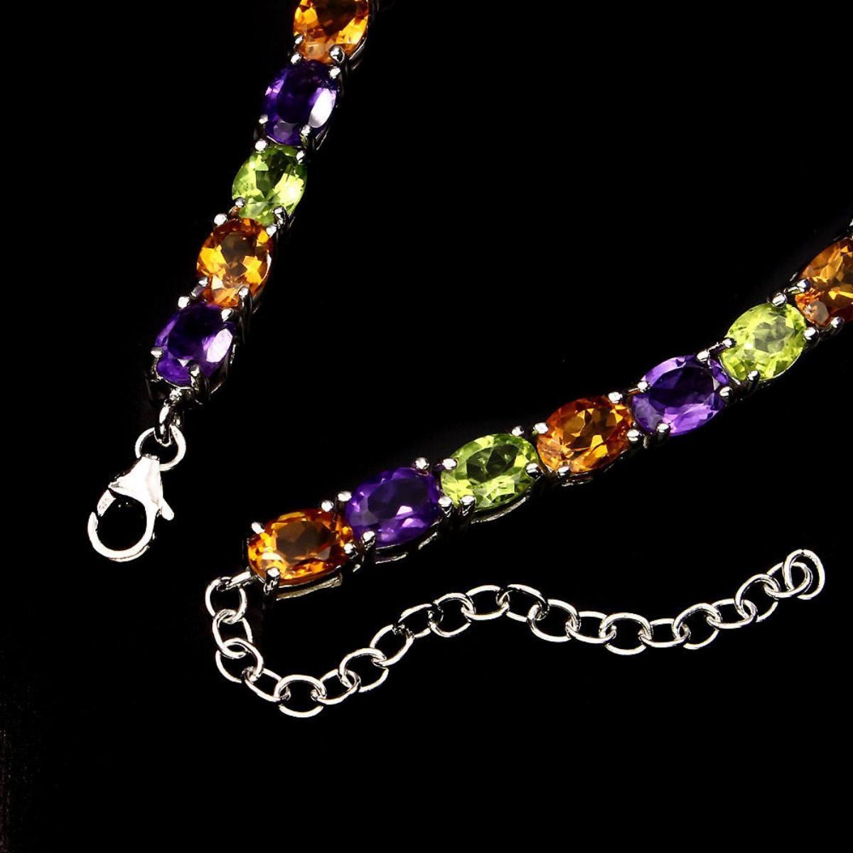 925 STERLING SILVER;PLATE14K WHITE GOLD;LENGTH (INCHES)8.5;MAIN STONEAMETHYST;OTHER GEMSCITRINE,PERIDOTTOTAL WEIGHT50.36 CT (TOTAL WEIGHT OF SILVER + STONE)DIMENSION* STONE 7.0 X 5.0 MM. * FACE BRACELET 187.0 X 5.0 MM.MAIN STONE SHAPEOVAL CUTMAIN STONE COLORTOP INTENSE PURPLECLARITY/GRADEIF TO VVSLUSTERGORGEOUSTREATMENTUNHEATEDORIGINURUGURYHARDNESS6.5 - 7.0
