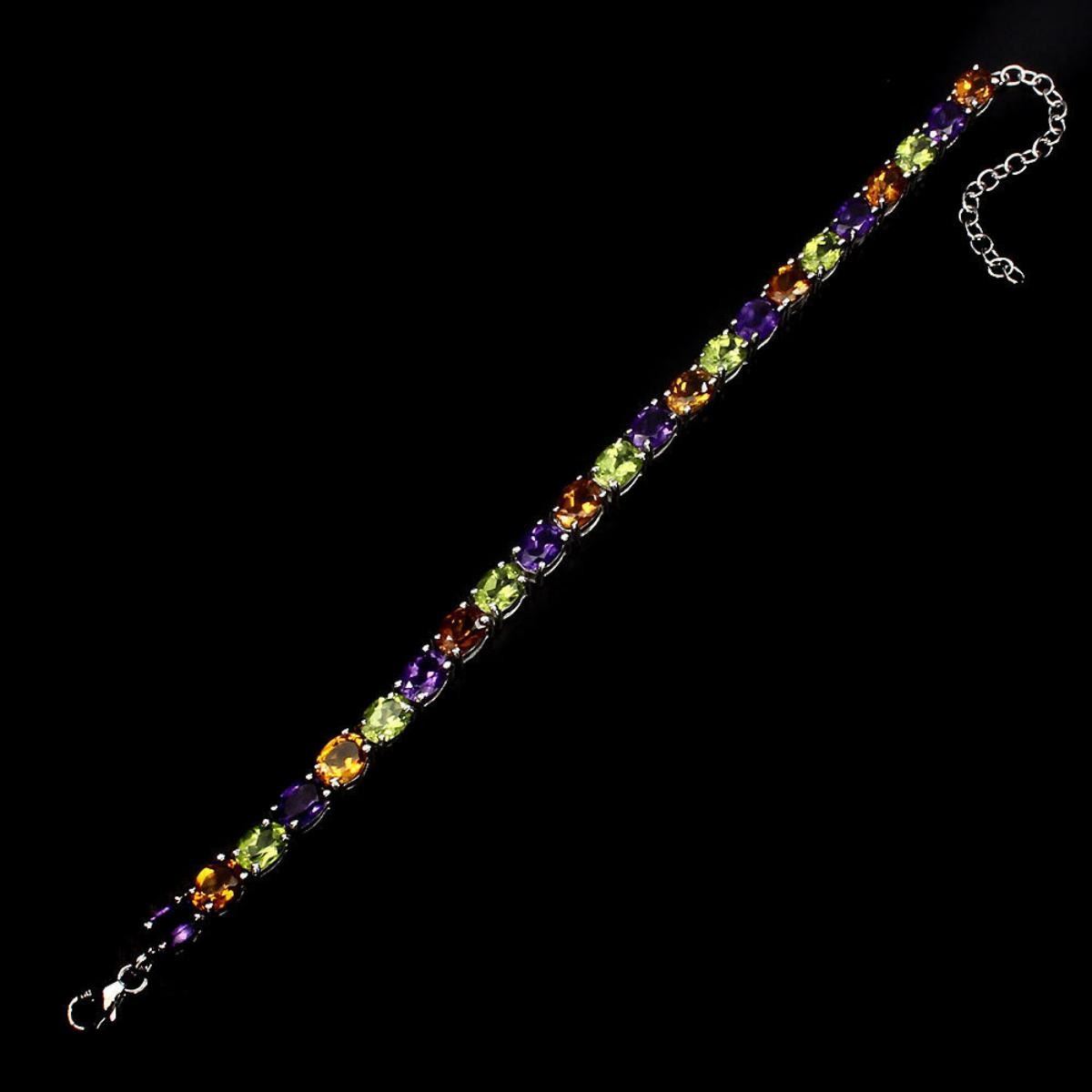 925 STERLING SILVER;PLATE14K WHITE GOLD;LENGTH (INCHES)8.5;MAIN STONEAMETHYST;OTHER GEMSCITRINE,PERIDOTTOTAL WEIGHT50.36 CT (TOTAL WEIGHT OF SILVER + STONE)DIMENSION* STONE 7.0 X 5.0 MM. * FACE BRACELET 187.0 X 5.0 MM.MAIN STONE SHAPEOVAL CUTMAIN STONE COLORTOP INTENSE PURPLECLARITY/GRADEIF TO VVSLUSTERGORGEOUSTREATMENTUNHEATEDORIGINURUGURYHARDNESS6.5 - 7.0