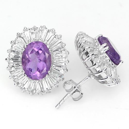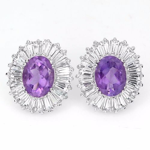 AMETHYST & WHITE TOPAZ (NATURAL) 14K WHITE GOLD COATING 925 SILVER EARRINGS.......FACE EARRINGS 16.0 X 15.0 MM.; Shape - OVAL FACET & TAPERED BAGUETTE CUT; Color - TOP RICH PURPLE & TOP WHITE; Clarity.....IF/VVS; Total Weight - 23.56 carats; Origin - Brazil...MSRP - 550