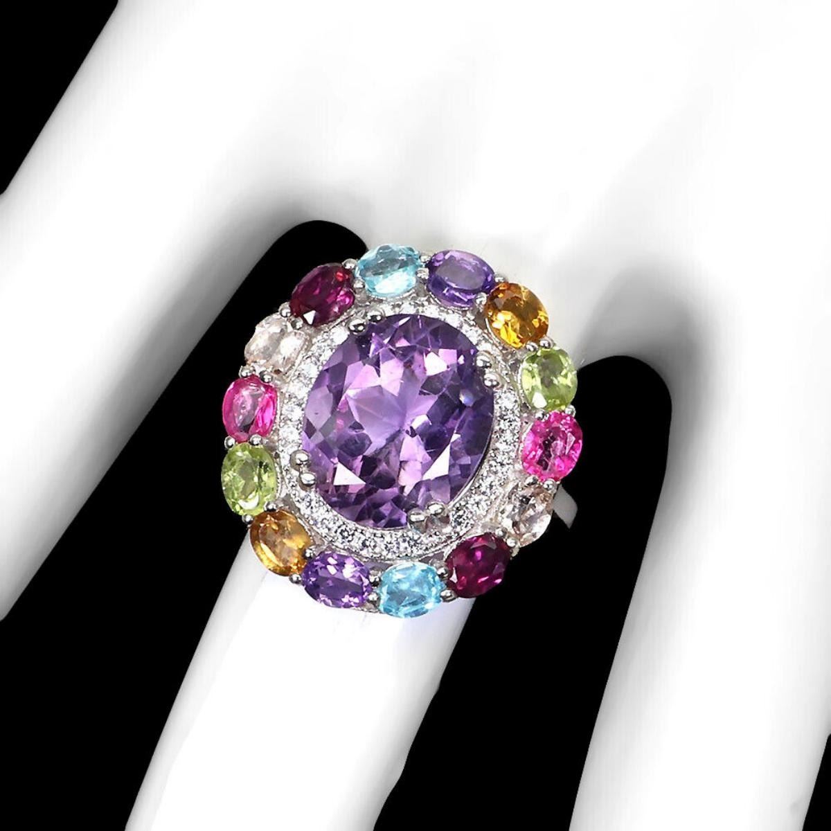 925 STERLING SILVER;PLATE-14K WHITE GOLD;RING SIZE/Resizable-8MAIN STONE-AMETHYST;OTHER GEMS-APATITE, CITRINE, SIMULATED CZ, MORGANITE, PERIDOT, PINK TOPAZ, RHODOLITE GARNET;TOTAL WEIGHT-5.41 GRAM (TOTAL WEIGHT OF SILVER + STONE)DIMENSION-* STONE 4.0 X 3.0 TO 12.0 X 10.0 MM.;* FACE RING- 22.0 X 20.0 MM.;MAIN STONE SHAPE-OVAL CUT;MAIN STONE COLOR-TOP RICH PURPLE;CLARITY/GRADE-IF TO VVS;TREATMENT-UNHEATED;ORIGIN-BRAZIL;HARDNESS-7;