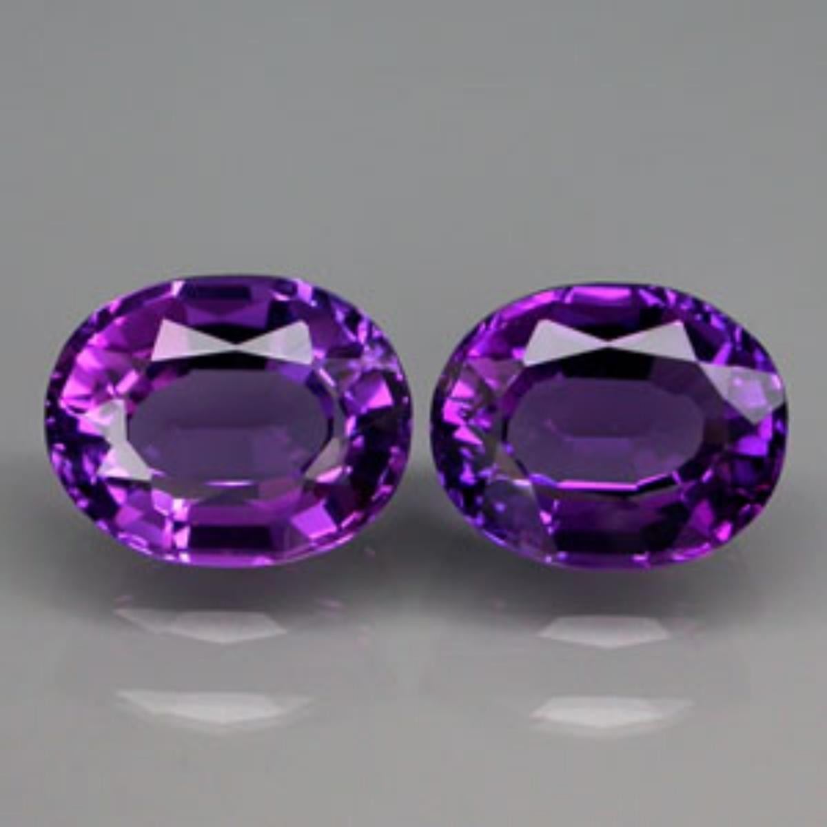 Natural Amethyst Pair 20.21 Carats - VVS.......Oval Shape...origin - Brazil....Hardness:7; Amethyst is a powerful and protective stone. It guards against psychic attack, transmuting the energy into love and protecting the wearer from all types of harm, including geopathic or electromagnetic stress and ill wishes from others. Amethyst is a natural tranquiliser, it relieves stress and strain, soothes irritability, balances mood swings, dispels anger, rage, fear and anxiety. Alleviates sadness and grief, and dissolves negativity. Amethyst activates spiritual awareness, opens intuition and enhances psychic abilities. It has strong healing and cleansing powers. Amethyst encourages sobriety, having a sobering effect on overindulgence of alcohol, drugs or other addictions. It calms and stimulates the mind, helping you become more focused, enhancing memory and improving motivation. Amethyst assists in remembering and understanding dreams. It relieves insomnia. Encourages selflessness and spiritual wisdom.Amethyst boosts hormone production, tunes the endocrine system and metabolism. It strengthens the immune system, reduces pain and strengthens the body to fight against cancer. It destroys malignant tumours and aids in tissue regeneration. Cleanses the blood. Relieves physical, emotional and psychological pain or stress. Amethyst eases headaches and releases tension. It reduces bruising, swellings, injuries, and treats hearing disorders. Amethyst heals diseases of the lungs and respiratory tract, skin conditions, cellular disorders and diseases of the digestive tract.