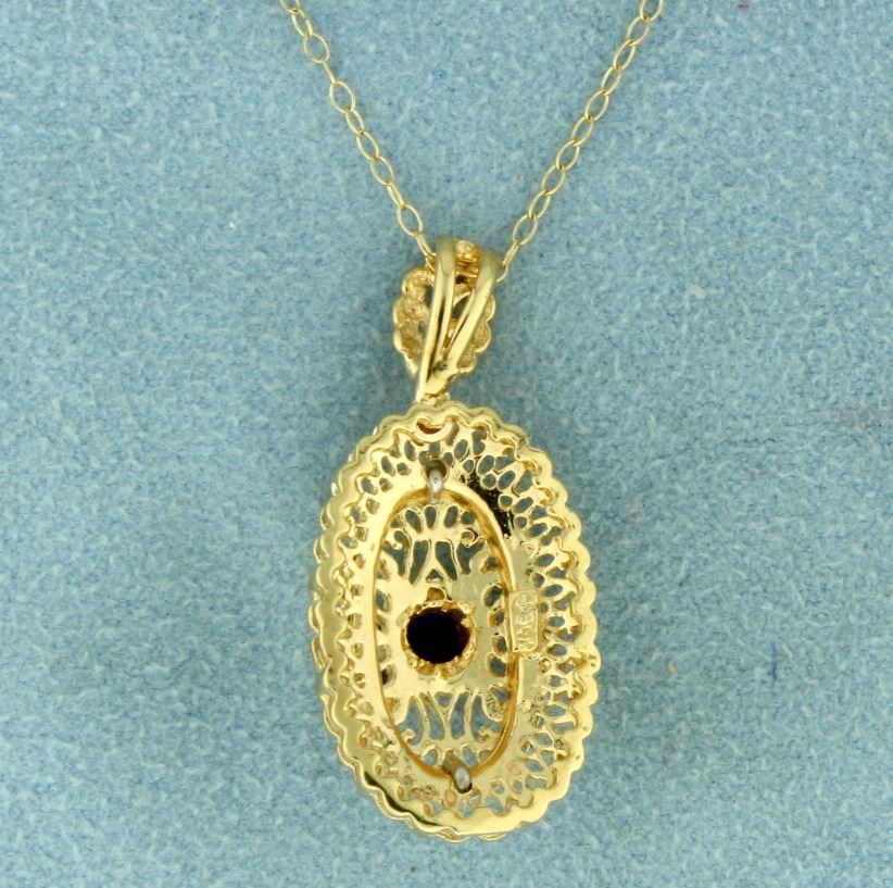 In 14k yellow and white gold. 1 1/4 inch long pendant containing a high quality 4mm square amethyst gemstone with a vibrant purple color and excellent clarity. Superb workmanship detail on pendant. Chain is 18 inches long and is also 14k yellow gold. 3.9g.