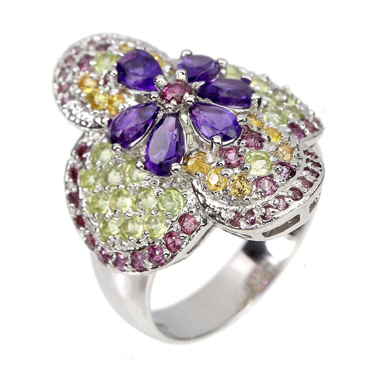 925 STERLING SILVER;PLATE-14K WHITE GOLD;RING SIZE-8.5(RESIZABLE);MAIN STONE-AMETHYST;OTHER GEMS-PERIDOT, RHODOLITE GARNET, SAPPHIRE;TOTAL WEIGHT-7.15 GRAM (TOTAL WEIGHT OF SILVER + STONE);DIMENSION-* STONE 1.0 TO 5.0 X 3.0 MM. * RING SIZE 8.5 * FACE RING 26.0 X 21.0 MM.;MAIN STONE SHAPE-PEAR; MAIN STONE COLOR- PURPLE;CLARITY/GRADE-IF TO VVS;TREATMENT-UNHEATED;ORIGIN-BRAZIL;HARDNESS-7;
