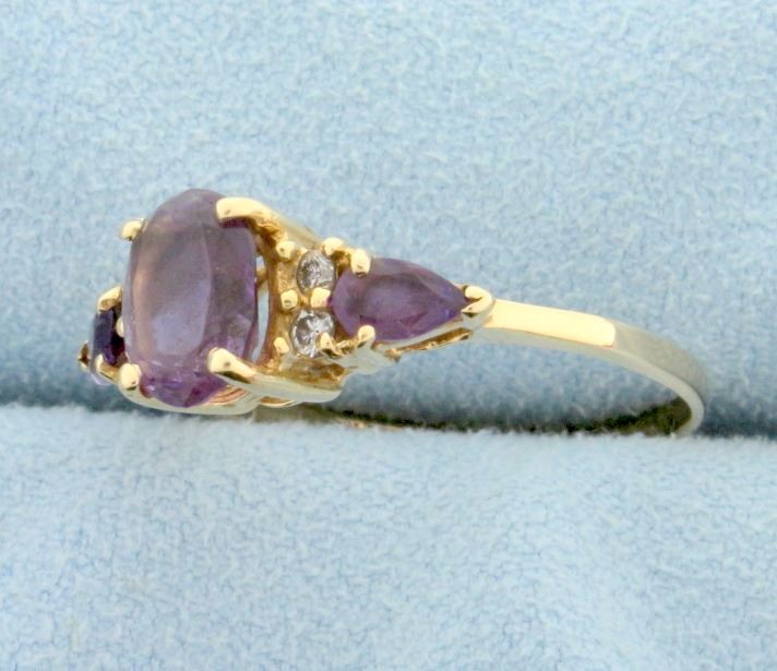 In 14k yellow gold. Center natural amethyst is 8x6mm,1.5ct, with vibrant purple color and excellent clarity. There are also two pear shaped .5ct natural amethyst gemstones of similar high quality. Also contains four high quality round .02ct diamonds. Size 8. 2.7g.