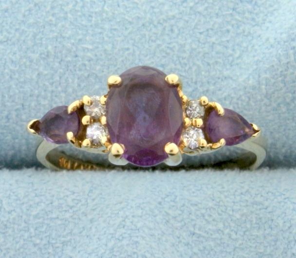 In 14k yellow gold. Center natural amethyst is 8x6mm,1.5ct, with vibrant purple color and excellent clarity. There are also two pear shaped .5ct natural amethyst gemstones of similar high quality. Also contains four high quality round .02ct diamonds. Size 8. 2.7g.