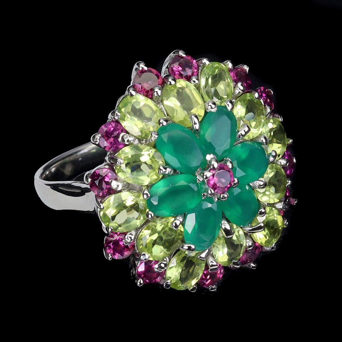 925 STERLING SILVER;PLATE14K WHITE GOLD;RING SIZE/resizable-9;MAIN STONE-AVENTURINE;OTHER GEMS-PERIDOT, RHODOLITE GARNET;TOTAL WEIGHT-10.89 GRAM (TOTAL WEIGHT OF SILVER + STONE)DIMENSION-* STONE 3.0 TO 6.0 X 4.0 MM. * RING SIZE 9.0 * FACE RING- 26.0 X 24.0 MM.;MAIN STONE SHAPE-OVAL CUT;MAIN STONE COLOR-AAA RICH GREEN;TREATMENT-UNHEATED;ORIGIN-BRAZIL;HARDNESS-6.0 - 6.5;