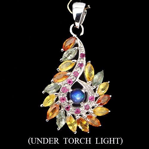 925 STERLING SILVER.....14K WHITE GOLD plated;MAIN STONE-BLACK OPAL;OTHER GEMS-RUBY,SAPPHIRETOTAL WEIGHT19.91 CT (TOTAL WEIGHT OF SILVER + STONE)DIMENSION* STONE 1.0 TO 5.0 X 2.5 MM. * FACE PENDANT 26.0 X 19.0 MM.MAIN STONE SHAPE-ROUND CABOCHON;MAIN STONE COLORBLACK WITH HOT RAINBOW LUSTERCLARITY/GRADEOPAQUELUSTERFABULOUSTREATMENTENHANCED BY SMOKINGORIGINAUSTRALIAHARDNESS5.5 - 9.0