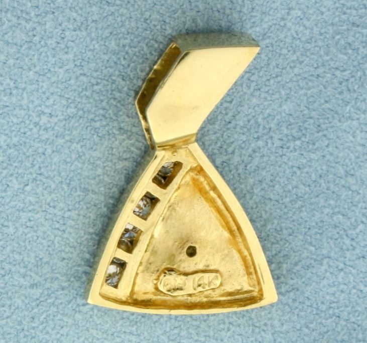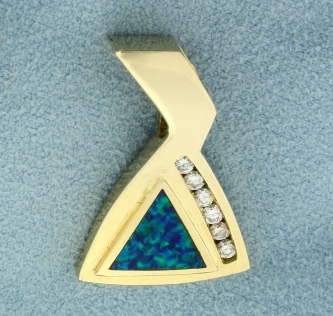In 14k yellow gold. Contains a 10mm triangular shaped high quality black opal gemstone with excellent blue and green play of color. Also contains six very high quality .05ct diamonds, VS clarity/G color. 1" long with bale. 6.3g.