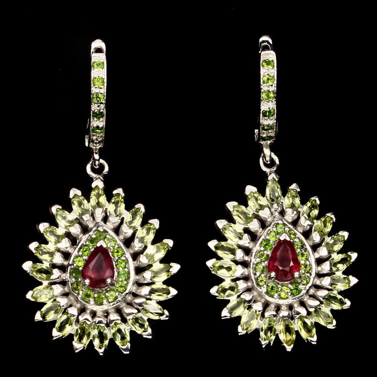 925 STERLING SILVER;PLATE14K WHITE GOLD;MAIN STONERUBY;OTHER GEMSCHROME DIOPSIDE,PERIDOT;TOTAL WEIGHT47.25 CT (TOTAL WEIGHT OF SILVER + STONE)DIMENSION* STONE 1.5 TO 6.0 X 4.0 MM. * FACE EARRINGS 40.0 X 20.0 MM.MAIN STONE SHAPEPEAR CUTMAIN STONE COLOR TOP BLOOD RED CLARITY/GRADE TRANSPARENT LUSTER DELUXE;;ORIGIN MADAGASCAR;HARDNESS 9;