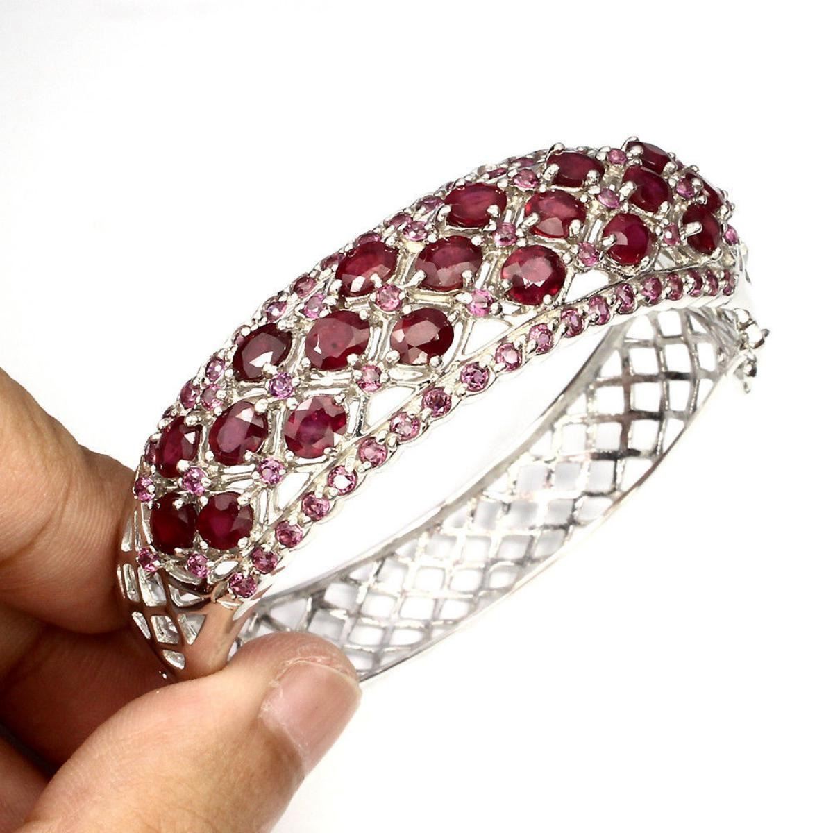 925 STERLING SILVER;PLATE14K WHITE GOLD;MAIN STONE-RUBY;;OTHER GEMS-RHODOLITE GARNET;TOTAL WEIGHT131.27 CT (TOTAL WEIGHT OF SILVER + STONE)DIMENSION* STONE 2.0 TO 5.0 X 4.0 MM. * DIAMETER 2.1 X 2.0 INCHES. * FACE BANGLE 58.0 X 17.0 MM.MAIN STONE SHAPEOVAL CUTMAIN STONE COLORTOP BLOOD REDCLARITY/GRADETRANSPARENTLUSTERPRECIOUSTREATMENT- yes;ORIGINMADAGASCARHARDNESS7.0 - 9.0