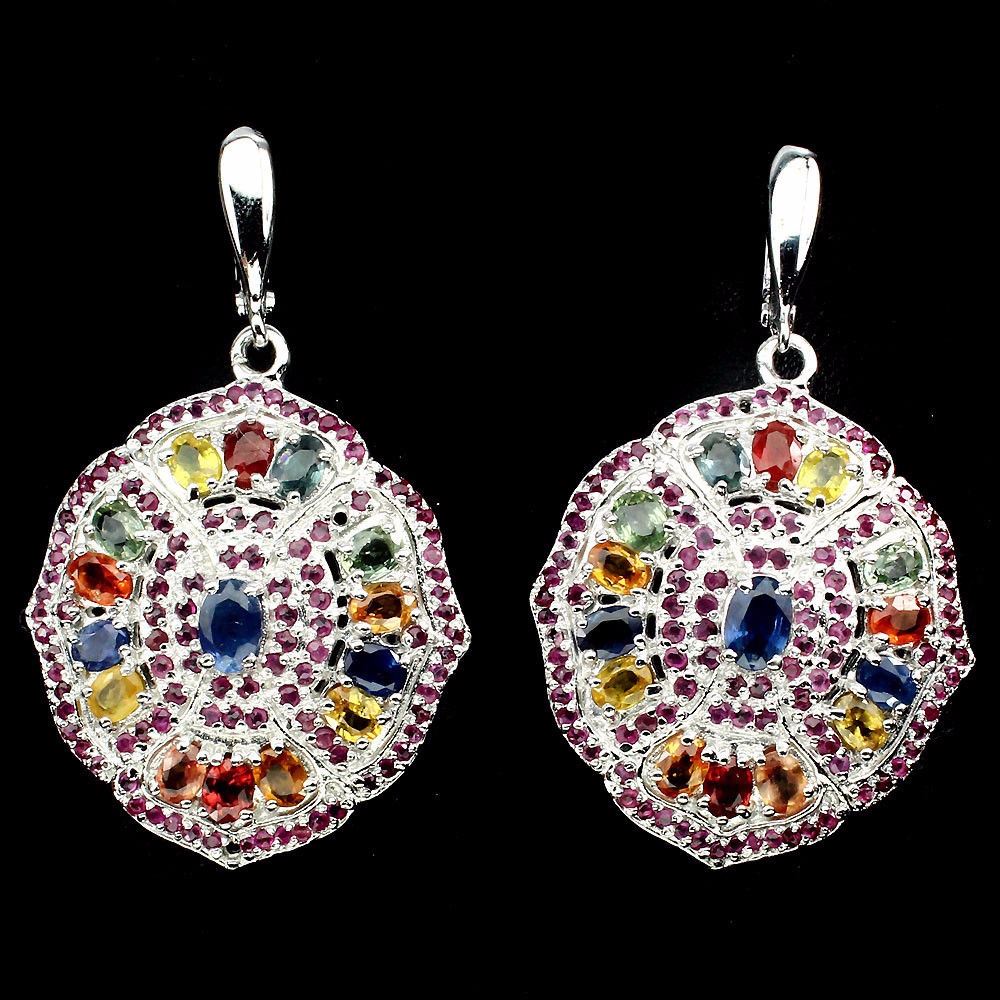 925 STERLING SILVER; PLATE -14K WHITE GOLD; MAIN STONE -SAPPHIRE; OTHER GEMS -RUBY; TOTAL WEIGHT -84.40 CT (TOTAL WEIGHT OF SILVER + STONE) DIMENSION * STONE 1.0 TO 6.0 X 4.0 MM. * FACE EARRINGS 47.0 X 29.0 MM.; MAIN STONE SHAPE- OVAL CUT; MAIN STONE COLOR -MULTI-COLOR; CLARITY/GRADE -IF TO VVS; ORIGIN SONGEA - AFRICA; HARDNESS -9