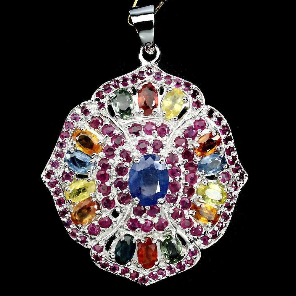 925 STERLING SILVER; PLATE -14K WHITE GOLD; MAIN STONE -SAPPHIRE; OTHER GEMS -RUBY; TOTAL WEIGHT -57.04 CT (TOTAL WEIGHT OF SILVER + STONE) DIMENSION * STONE 1.0 TO 6.0 X 4.0 MM. * FACE PENDANT 30.0 X 28.0 MM. MAIN STONE SHAPE -OVAL CUT; MAIN STONE COLOR -MULTI-COLOR; CLARITY/GRADE -IF TO VVS; LUSTER -GORGEOUS; ORIGIN SONGEA - AFRICA; HARDNESS -9;