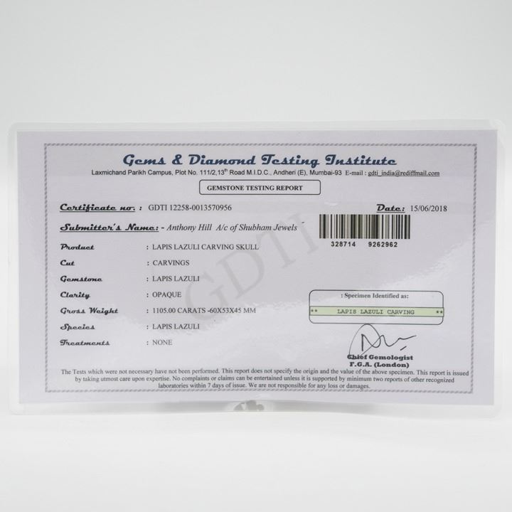 Huge Certified Natural 1105 Ct Blue Lapis Lazuli Hand Carved Skull. Measures 60 x 53 x 454mm.Very unique piece.