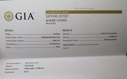 Natural Blue Sapphire 5.03 Carats VVS - GIA certified...Dimensions[mm] 9.08 x 8.87 x 7.08 [approx]....Hardness 9; natural earth mined..no treatment in any way other than gently heated only; Origin - Madgascar