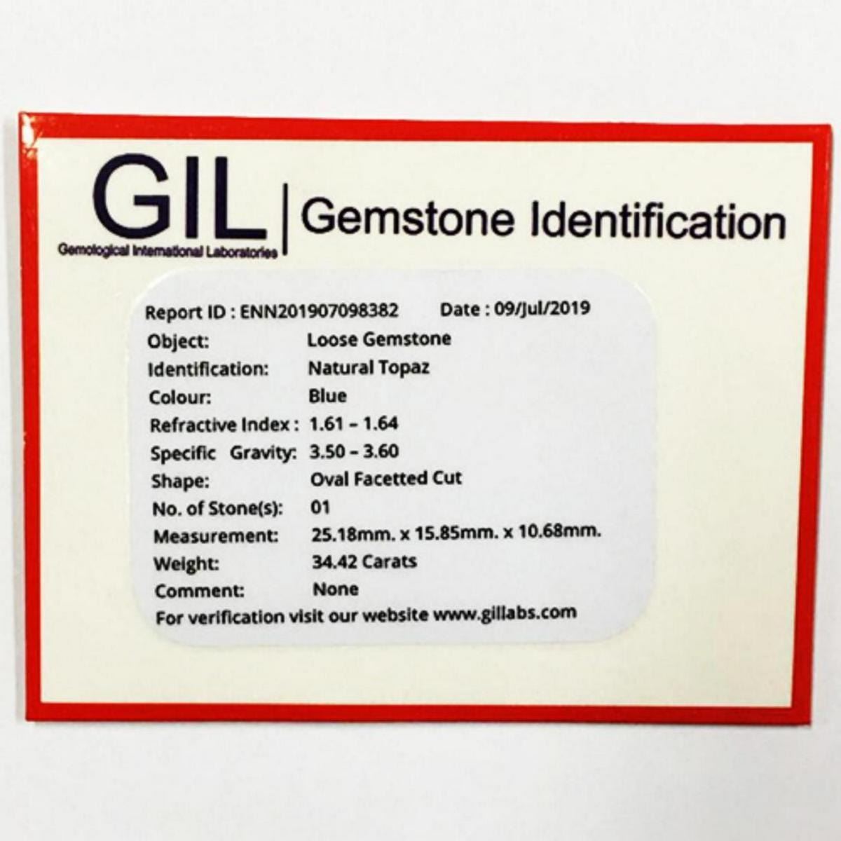 Natural Topaz (Certified) WEIGHT : 34.42 cts; SHAPE : Oval; SIZE ( L x W x D ) : 25.18 x 15.85 x 10.68 mm; QUANTITY : 1 piece COLOR : Blue (Natural Color) CLARITY : Flawless-VVS1 AAA Grade; ORIGIN : Brazil; HARDNESS : 8; LUSTER : Excellent!!! TREATMENT : Unheated & Untreated 100% Natural;