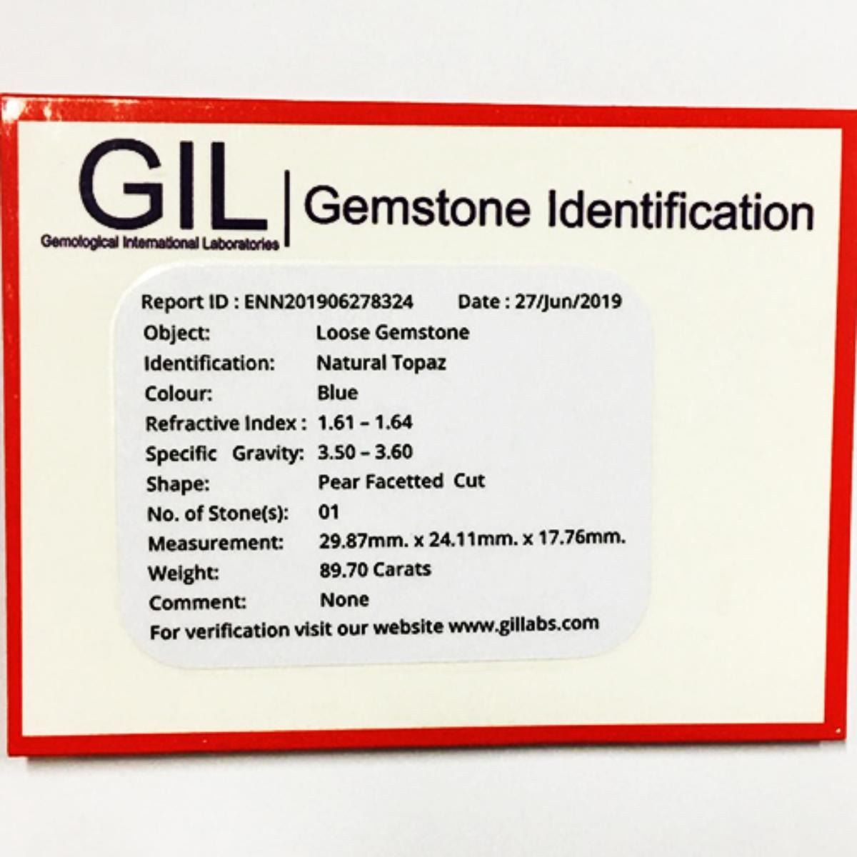 Natural Topaz (Certified) WEIGHT : 89.70 cts; SHAPE : Pear SIZE ( L x W x D ) : 29.87 x 24.11 x 17.76 mm QUANTITY : 1 piece COLOR : Blue (Natural Color) CLARITY : Flawless-VVS1 AAA Grade ORIGIN : Brazil HARDNESS : 8 LUSTER : Excellent!!! TREATMENT : Unheated & Untreated 100% Natural