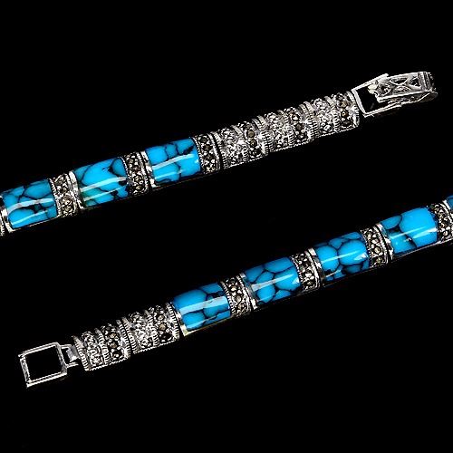 TURQUOISE (NATURAL) 925 SILVER BRACELET;UNIT OF ITEM (S):1 PIECE;WEIGHT (CT.):115.85 CT. (total weight of silver + stone)DIMENSION:* STONE 8.0 X 7.0 MM.* LENGTH 7.0 INCHES. * FACE BRACELET 164.0 X 7.0 MM.;SHAPE/CUT:FANCY CABOCHON;COLOR:TOP RICH BLUE;LUSTER:ELEGANT;ORIGIN:VIETNAMHARDNESS:5.0 - 6.5