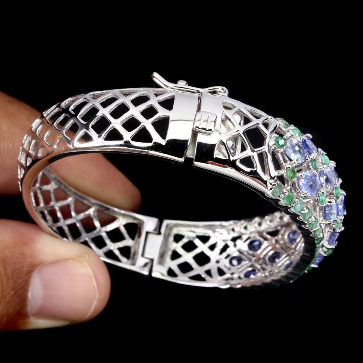 925 STERLING SILVER;PLATE-2-TONE WHITE & YELLOW 14K GOLD;;MAIN STONE-TANZANITEOTHER GEMS-EMERALD;TOTAL WEIGHT123.74 CT (TOTAL WEIGHT OF SILVER + STONE)DIMENSION* STONE 2.0 TO 5.0 X 4.0 MM. * DIAMETER 2.1 X 2.0 INCHES. * FACE BANGLE 58.0 X 12.0 MM.MAIN STONE SHAPEOVAL CUTMAIN STONE COLORTOP NICE BLUE VIOLETCLARITY/GRADETRANSPARENTLUSTERMESMERIZINGTREATMENTUNHEATEDORIGINTANZANIA - AFRICAHARDNESS7.0 - 7.5