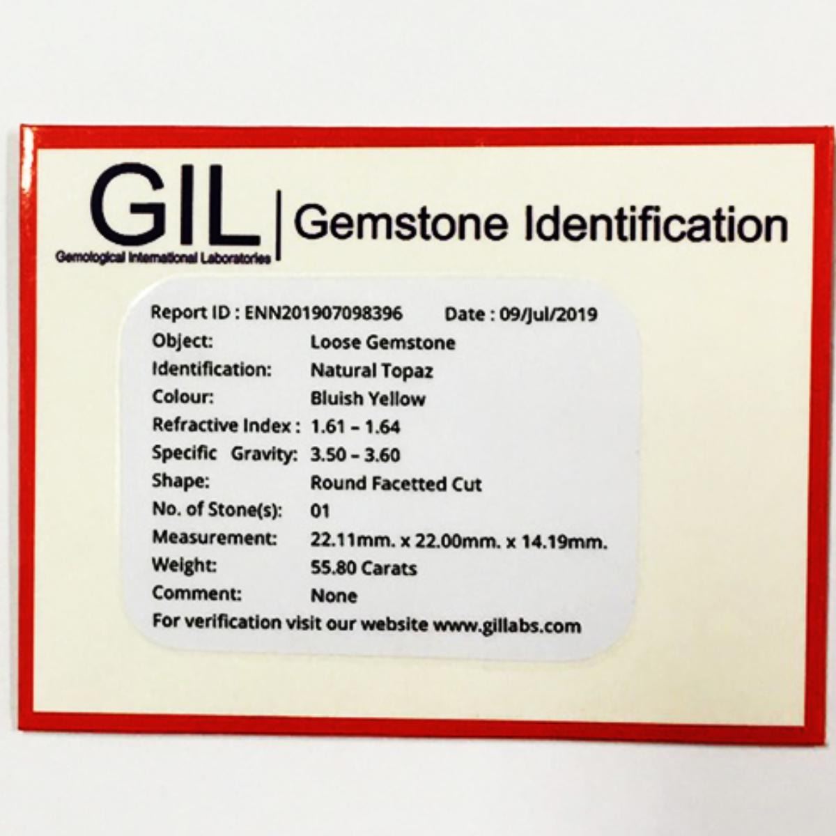 Natural Topaz Certified; WEIGHT : 55.80 cts; SHAPE : Round SIZE ( L x W x D ) : 22.11 x 22.00 x 14.19 mm; QUANTITY : 1 piece; COLOR : Bluish Yellow (Natural Color); CLARITY : Flawless-VVS1 AAA Grade; ORIGIN : Brazil; HARDNESS : 8; LUSTER : Excellent!!! TREATMENT : Unheated & Untreated 100% Natural;