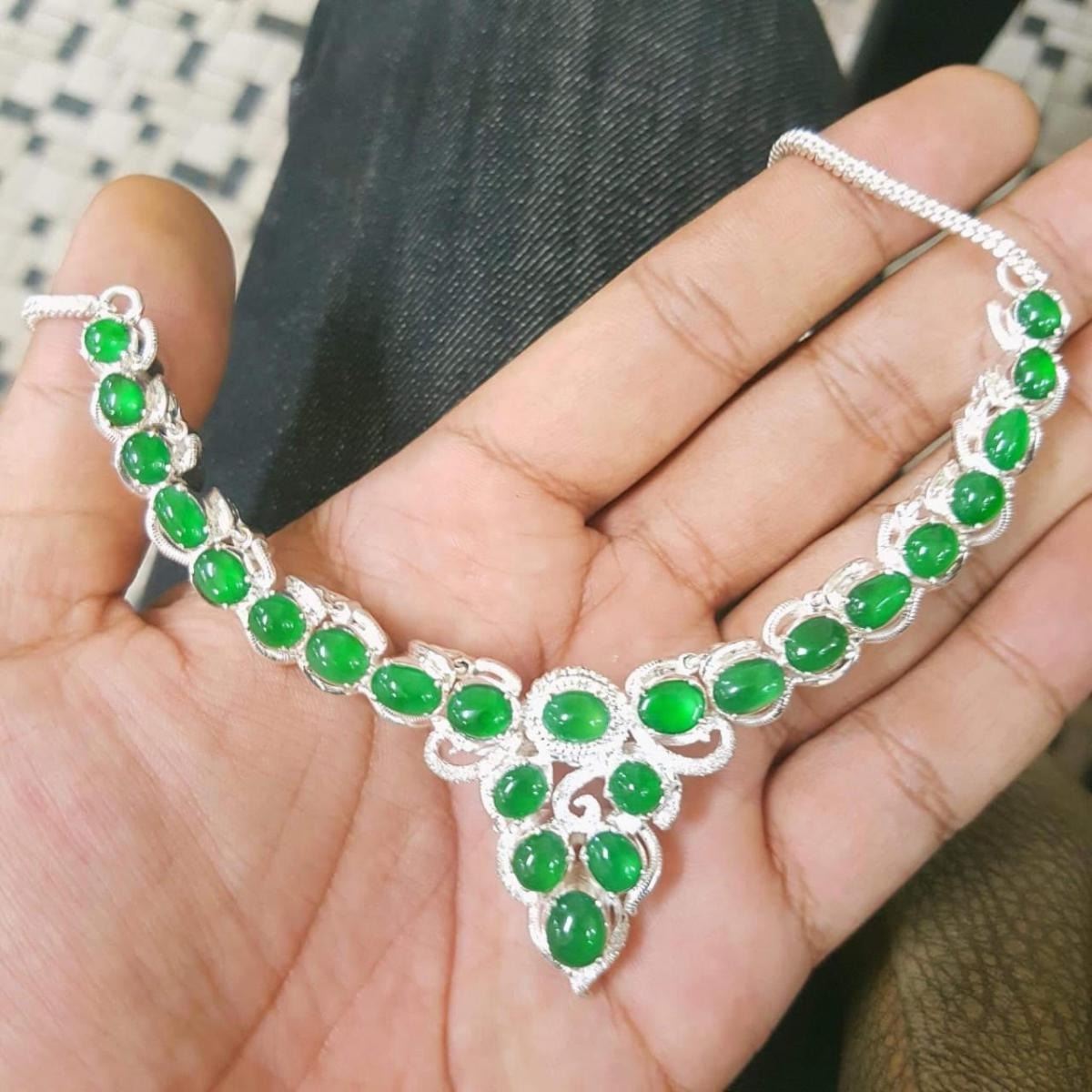 Natural Burma Jade/Jadite 64.89 grams (Total Necklace weight)....Type A Necklace.......sterling silver with 14k white Gold overlay.........Untreated Burma jade Necklace....completely untreated Jade ....Origin - Burma...AGL Certified