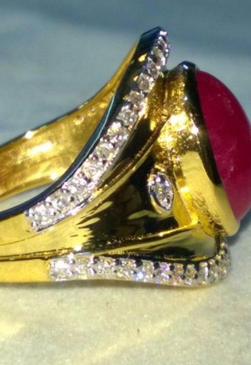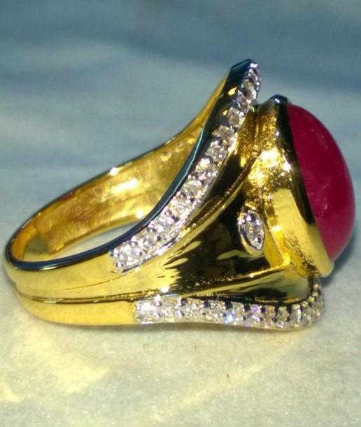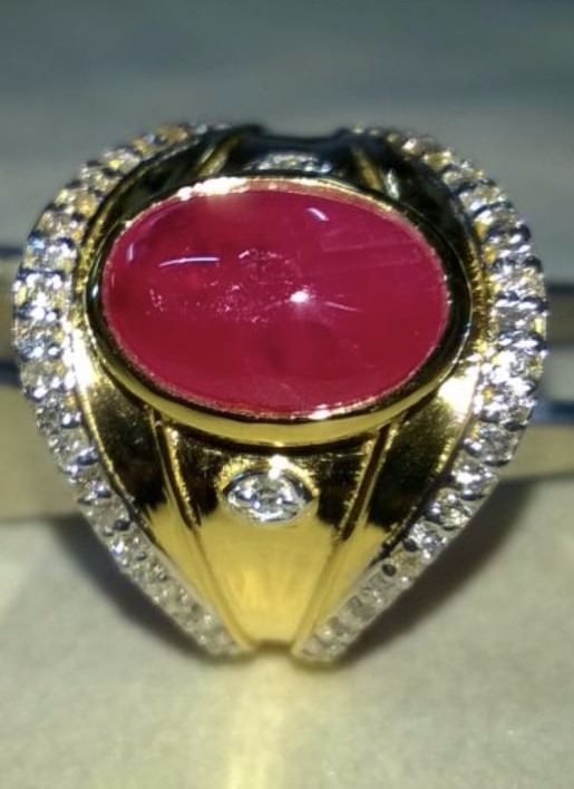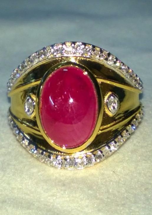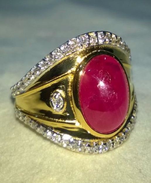 Natural Burma Ruby & Diamond Ring - GIA Certified......18k Solid yellow gold 7.3 grams...Ring size 7.00 (can be resized);...Burma Ruby 4.03 Carats......Cabochan....oval shape; Diamonds 1.01 Carats....VS2/SI1 - G/H.