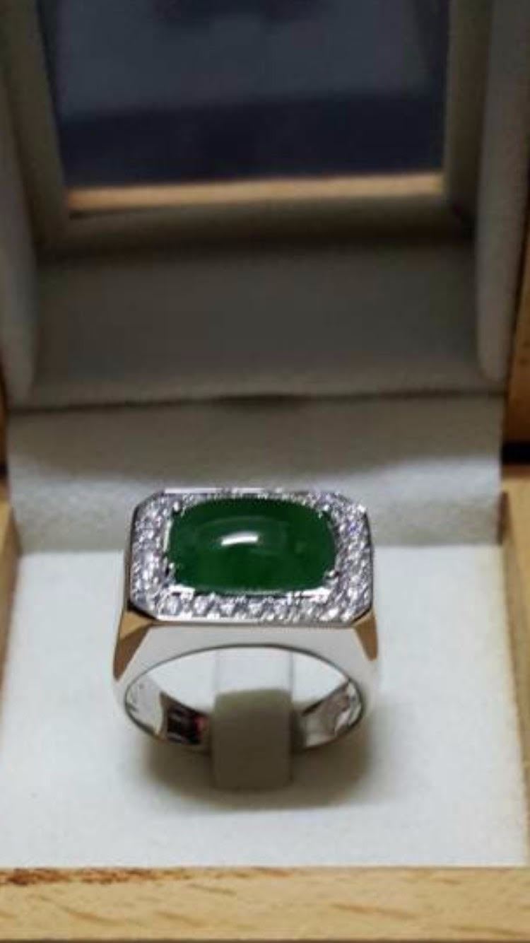 18 k solid white Gold.....0.30 Cts white Diamonds; Natural untreated certified Burmese jade...4.222 Carats; Ring Size 58/59; Jade origin - Burma....Certificate attached