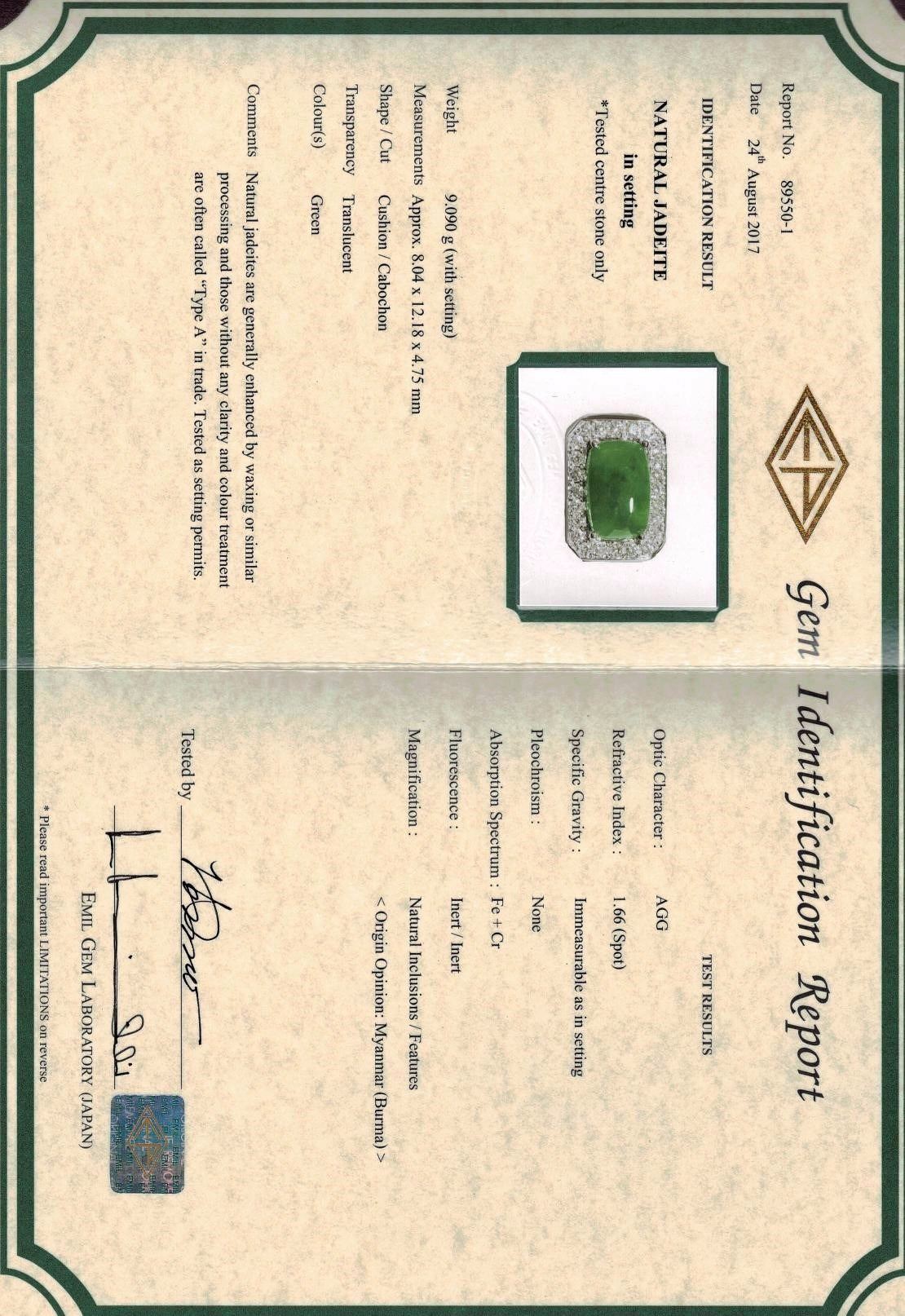 18 k solid white Gold.....0.30 Cts white Diamonds; Natural untreated certified Burmese jade...4.222 Carats; Ring Size 58/59; Jade origin - Burma....Certificate attached