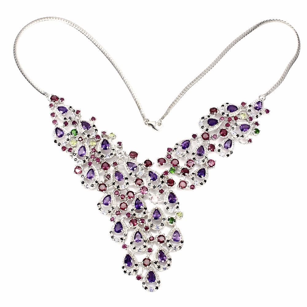 925 STERLING SILVER.......... 14K WHITE GOLD PLATED; LENGTH (INCHES) 18; GEMS - BURMESE SPINEL; CHROME DIOPSIDE,PERIDOT,RHODOLITE GARNET,RUBY,TANZANITE TOTAL WEIGHT 216.07 CT (TOTAL WEIGHT OF SILVER + STONE) DIMENSION * STONE 1.0 TO 6.0 X 4.0 MM. * STONES PART LENGTH 120.0 X 72.0 MM.; MAIN STONE SHAPE -PEAR CUT; MAIN STONE COLOR -TOP INTENSE PURPLE; CLARITY/GRADE -IF TO VVS; TREATMENT -UNHEATED; ORIGIN -URUGURY; HARDNESS -6.5 - 9.0