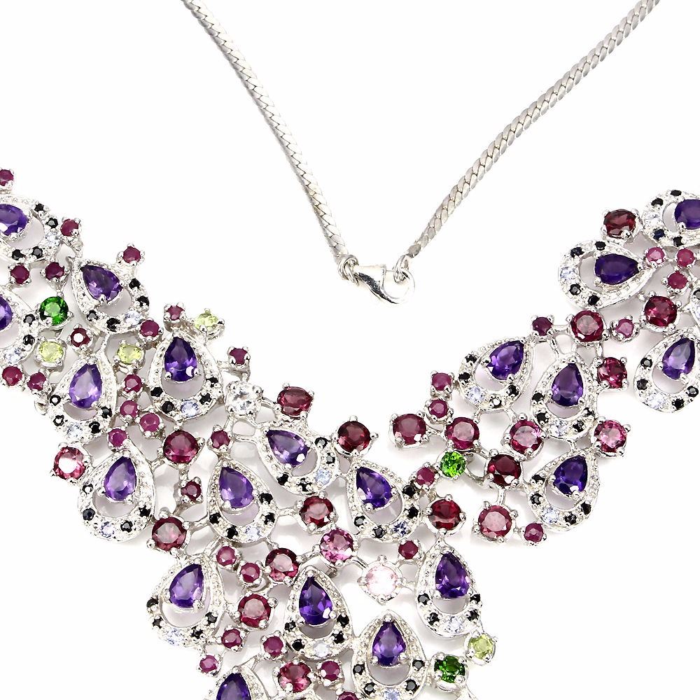 925 STERLING SILVER.......... 14K WHITE GOLD PLATED; LENGTH (INCHES) 18; GEMS - BURMESE SPINEL; CHROME DIOPSIDE,PERIDOT,RHODOLITE GARNET,RUBY,TANZANITE TOTAL WEIGHT 216.07 CT (TOTAL WEIGHT OF SILVER + STONE) DIMENSION * STONE 1.0 TO 6.0 X 4.0 MM. * STONES PART LENGTH 120.0 X 72.0 MM.; MAIN STONE SHAPE -PEAR CUT; MAIN STONE COLOR -TOP INTENSE PURPLE; CLARITY/GRADE -IF TO VVS; TREATMENT -UNHEATED; ORIGIN -URUGURY; HARDNESS -6.5 - 9.0