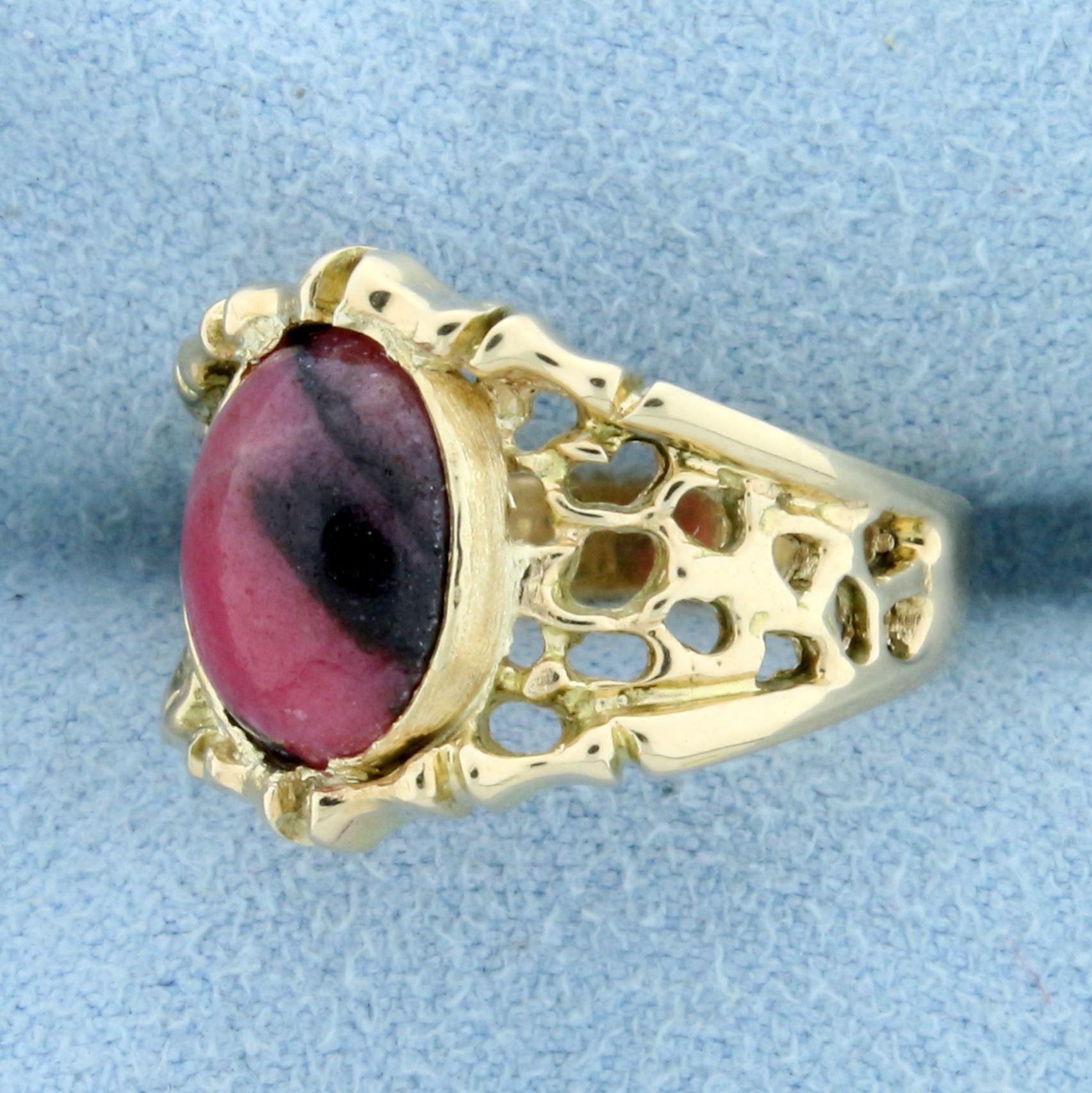 In 14K Yellow Gold. Contains a 10 x 8mm high quality Natural Oval Cabochon Rhodonite gemstone with beautiful pink color and unique striations of minerals running through it. Size 5. 4.8g.