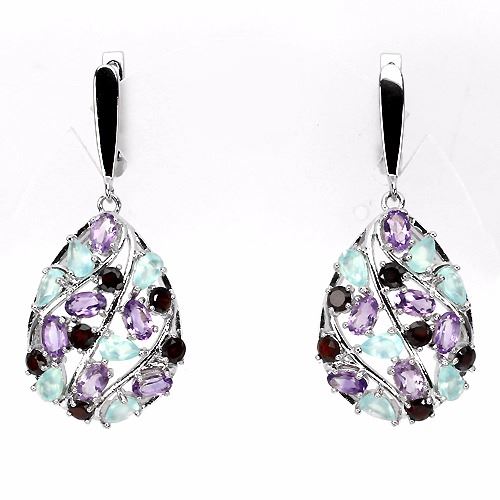 CHALCEDONY , AMETHYST & MOZAMBIQUE GARNET (NATURAL) 14K WHITE GOLD PLATED 925 SILVER EARRINGS;UNIT OF ITEM (S):2 PIECES;WEIGHT (CT.):54.37 CT. (total weight of silver + stone);DIMENSION:* STONE 3.0 TO 5.0 X 3.0 MM. * FACE EARRINGS 43.0 X 19.0 MM.;SHAPE/CUT:PEAR, OVAL & ROUND FACET;COLOR:TOP FANCY COLORS;CLARITY/GRADE:TRANSPARENT & IF TO VVS;LUSTER:GORGEOUS;TREATMENT:HEATED TREATED & UNHEATED;ORIGIN:AFRICA & BRAZIL;HARDNESS:6.5 - 7.5-------------------------Blue Chalcedony is an excellent crystal for public speakers and those who speak for a living. Lawyers and political speakers might benefit from touching this stone to the tip of their tongue while listening to their opponents to enhance their counter arguments.Actors might rub it against their lips and throat, while singers may drink a glass of water in which Chalcedony has soaked for an hour before going on stage. Wearing this crystal around the neck helps overcome stage fright and the fear of public speaking. [Megemont, 50]As a stone of peace and peace-making, Blue Chalcedony encourages stillness and calm in the home for those at odds with one another, vying for their place in the pecking order. It is also beneficial for daily journeys to work, or stressful trips involving children. [Eason, 244]
