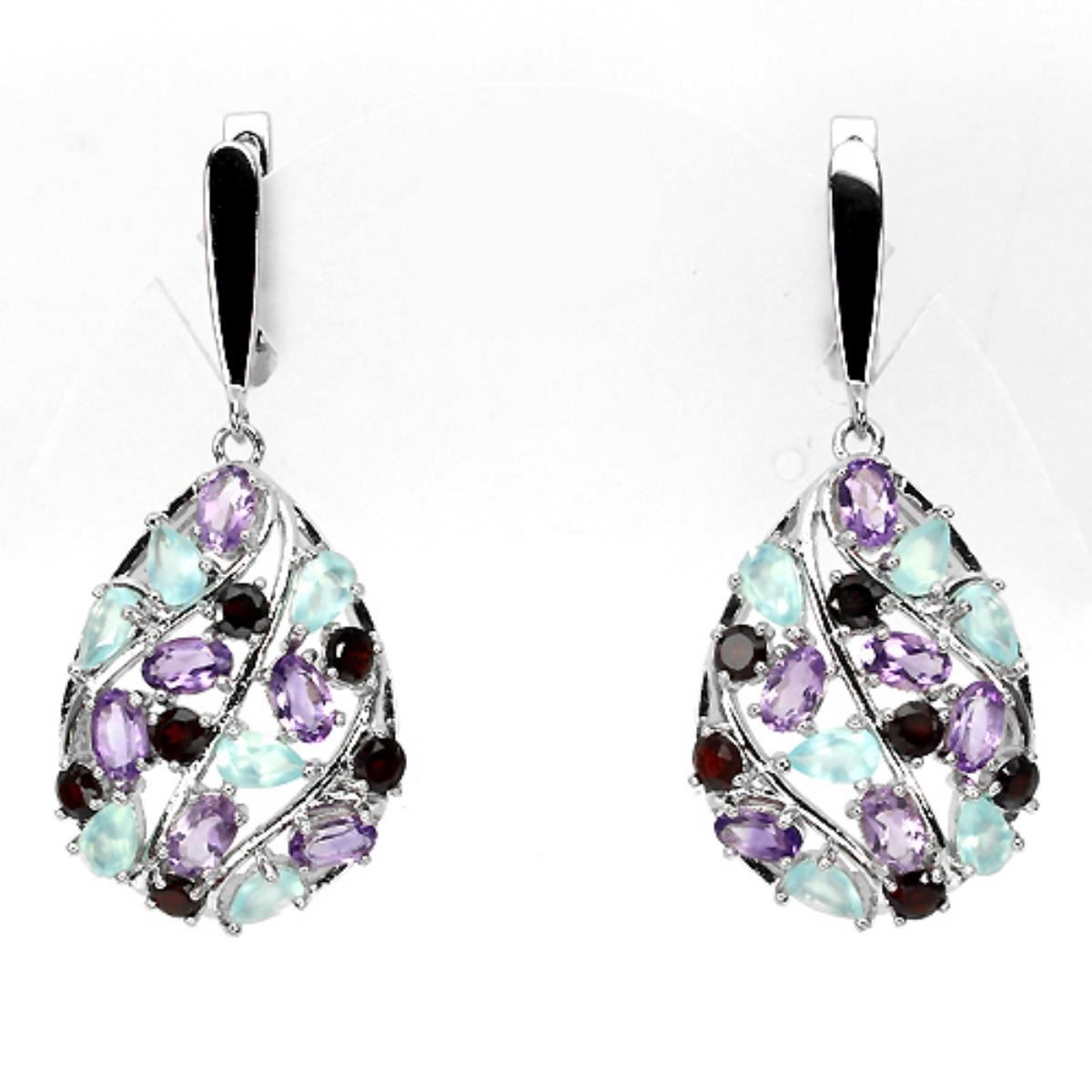 CHALCEDONY , AMETHYST  MOZAMBIQUE GARNET (NATURAL) 14K WHITE GOLD PLATED 925 SILVER EARRINGS;UNIT OF ITEM (S):2 PIECES;WEIGHT (CT.):54.37 CT. (total weight of silver + stone);DIMENSION:* STONE 3.0 TO 5.0 X 3.0 MM. * FACE EARRINGS 43.0 X 19.0 MM.;SHAPE/CUT:PEAR, OVAL  ROUND FACET;COLOR:TOP FANCY COLORS;CLARITY/GRADE:TRANSPARENT  IF TO VVS;LUSTER:GORGEOUS;TREATMENT:HEATED TREATED  UNHEATED;ORIGIN:AFRICA  BRAZIL;HARDNESS:6.5 - 7.5-------------------------Blue Chalcedony is an excellent crystal for public speakers and those who speak for a living. Lawyers and political speakers might benefit from touching this stone to the tip of their tongue while listening to their opponents to enhance their counter arguments.Actors might rub it against their lips and throat, while singers may drink a glass of water in which Chalcedony has soaked for an hour before going on stage. Wearing this crystal around the neck helps overcome stage fright and the fear of public speaking. [Megemont, 50]As a stone of peace and peace-making, Blue Chalcedony encourages stillness and calm in the home for those at odds with one another, vying for their place in the pecking order. It is also beneficial for daily journeys to work, or stressful trips involving children. [Eason, 244]