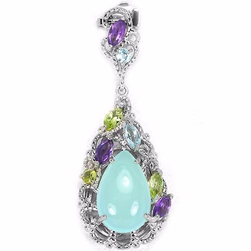 CHALCEDONY AMETHYST PERIDOT TOPAZ 925 SILVER PENDANT 14K WHITE GOLD COATING...........STONE DIMENSION14 X 9 MM.;MAIN STONE WEIGHT7 CARAT;COLORLAVENDER BLUE;CLARITYTRANSLUCENT;LUSTERENCHANTING'TREATMENT-NATURAL UNHEATED;ORIGIN OF STONEAFRICA;HARDNESS7;OTHERFACE OF PENDANT 40 X 16 MM.'; MULTI COLOR GEMSTONE 5 X 2.5 MM. , 2.5 MM.; TOTAL 4.7 G.