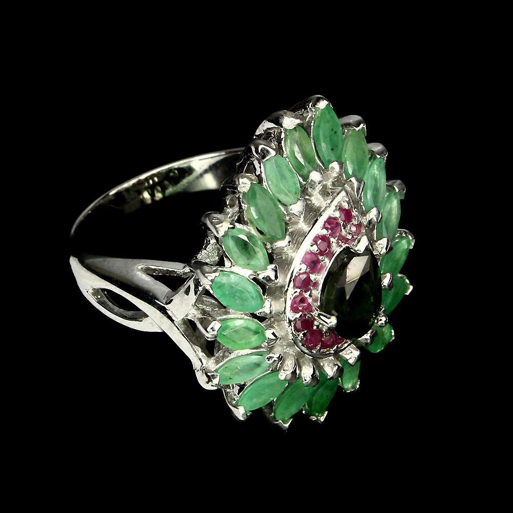 925 STERLING SILVER;PLATE14K WHITE GOLD;RING SIZE8(resizeable)MAIN STONECHROME DIOPSIDE;OTHER GEMSEMERALD,RUBY;TOTAL WEIGHT47.71 CT (TOTAL WEIGHT OF SILVER + STONE)DIMENSION* STONE 1.5 TO 7.0 X 5.0 MM. * FACE RING 25.0 X 22.0 MM.;MAIN STONE SHAPEPEAR CUT;MAIN STONE COLORTOP RICH GREEN;CLARITY/GRADEIF;LUSTERELEGANTTREATMENTUNHEATED;ORIGINRUSSIA;HARDNESS5.0 - 9.0;