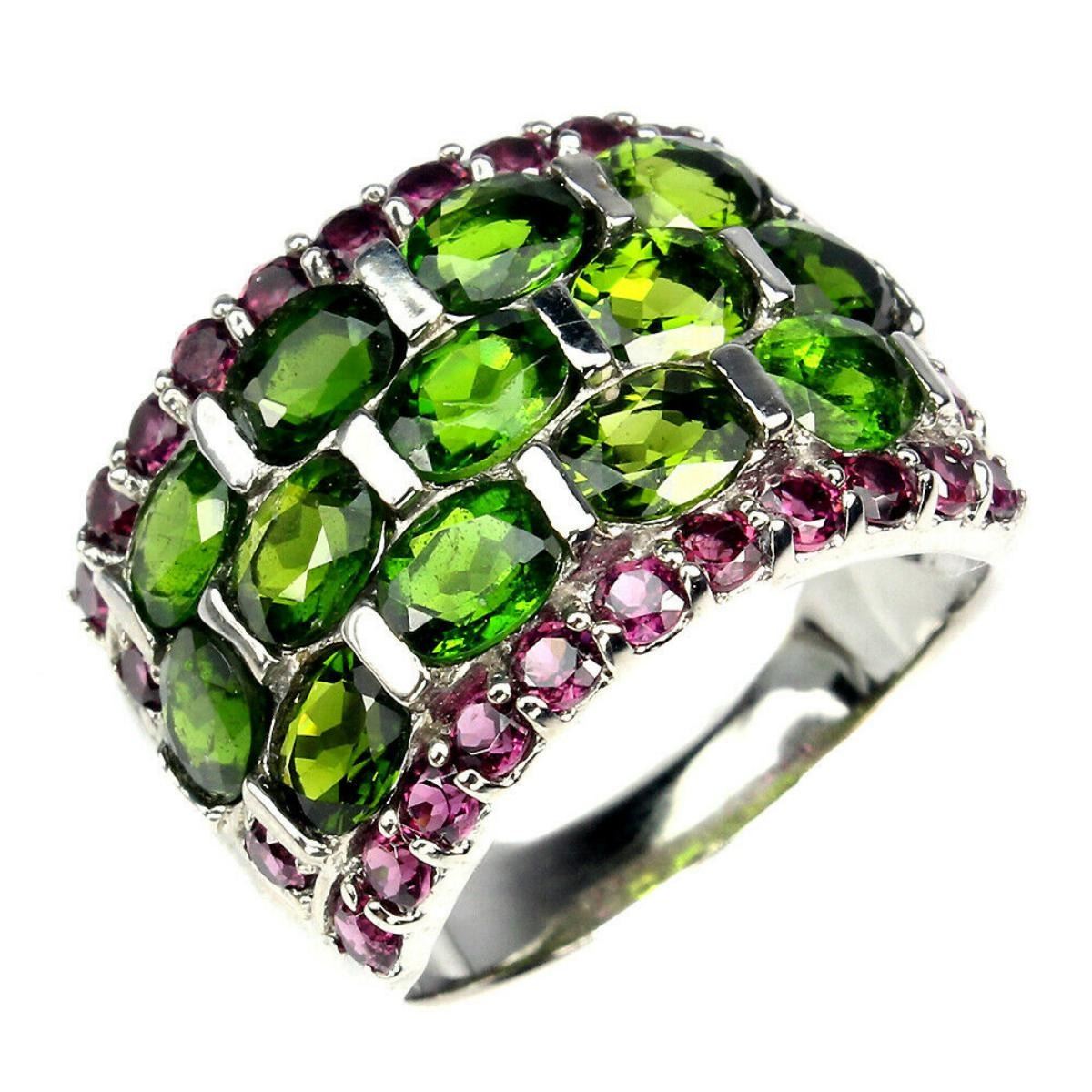 925 STERLING SILVER;PLATE-14K WHITE GOLD;RING SIZE/resizeable-9;MAIN STONE-CHROME DIOPSIDE;OTHER GEMS-RHODOLITE GARNET;TOTAL WEIGHT-7.82 GRAM (TOTAL WEIGHT OF SILVER + STONE)DIMENSION-* STONE 2.0 TO 5.0 X 4.0 MM. * RING SIZE 9.0 * FACE RING- 23.0 X 16.0 MM.;MAIN STONE SHAPE-OVAL CUT;MAIN STONE COLOR-TOP RICH GREEN;CLARITY/GRADE-IF TO VVS;LUSTER-GORGEOUS;TREATMENT-UNHEATED;ORIGIN-RUSSIA;HARDNESS-5.0 - 5.5;