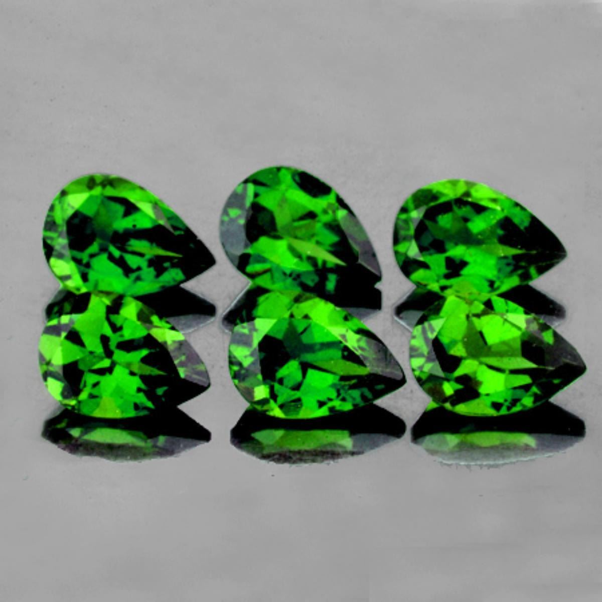 Natural Diopside; SHAPE : Pear; SIZE ( L x W x D ) : 4.00 x 3.00 mm; QUANTITY : 6 pieces ( Perfectly Matched Set ) COLOR : Chrome Green AAA COLOR; CLARITY : Flawless-VVS1 AAA Grade; ORIGIN : Russia; HARDNESS : 6; LUSTER : Excellent!!! TREATMENT : 100% Natural Unheated;
