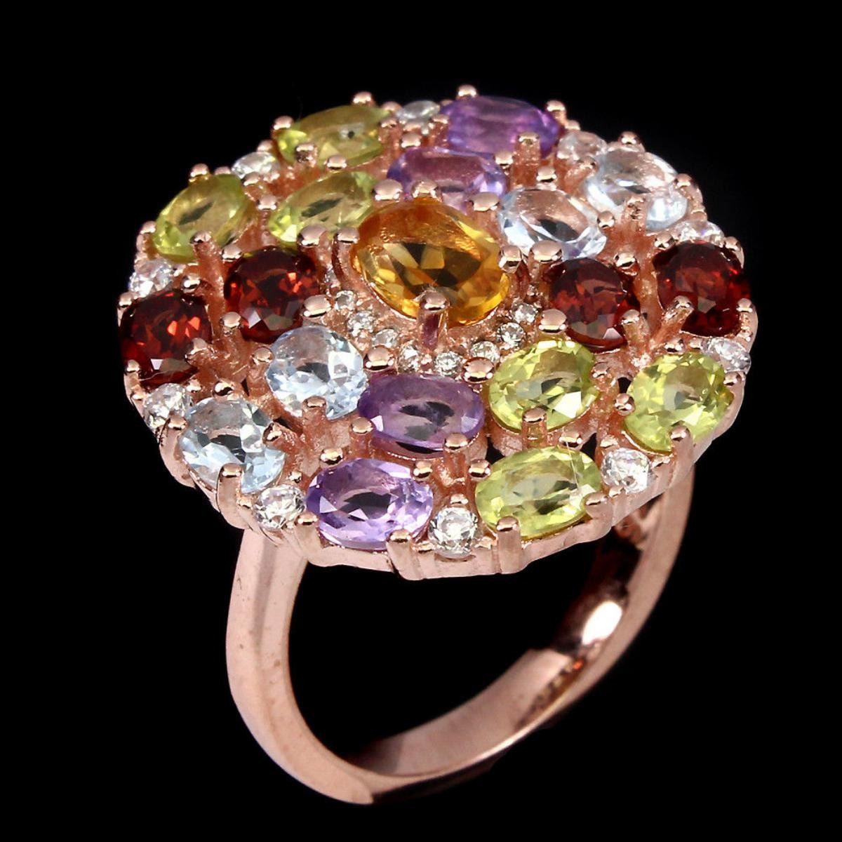 925 STERLING SILVERPLATE14K ROSE GOLDRING SIZE..6 (can be resized)MAIN STONECITRINEOTHER GEMSAMETHYST,CUBIC ZIRCONIA,MOZAMBIQUE GARNET,PERIDOT,SKY BLUE TOPAZTOTAL WEIGHT31.75 CT (TOTAL WEIGHT OF SILVER + STONE)DIMENSION* STONE 4.0 X 3.0 TO 6.0 X 4.0 MM. * CZ 1.0 TO 2.0 MM. * FACE RING 22.0 X 21.0 MM.MAIN STONE SHAPEOVAL CUTMAIN STONE COLORMULTI-COLORCLARITY/GRADEIF TO VVSLUSTERDELIGHTFULTREATMENTUNHEATEDORIGINBRAZIL