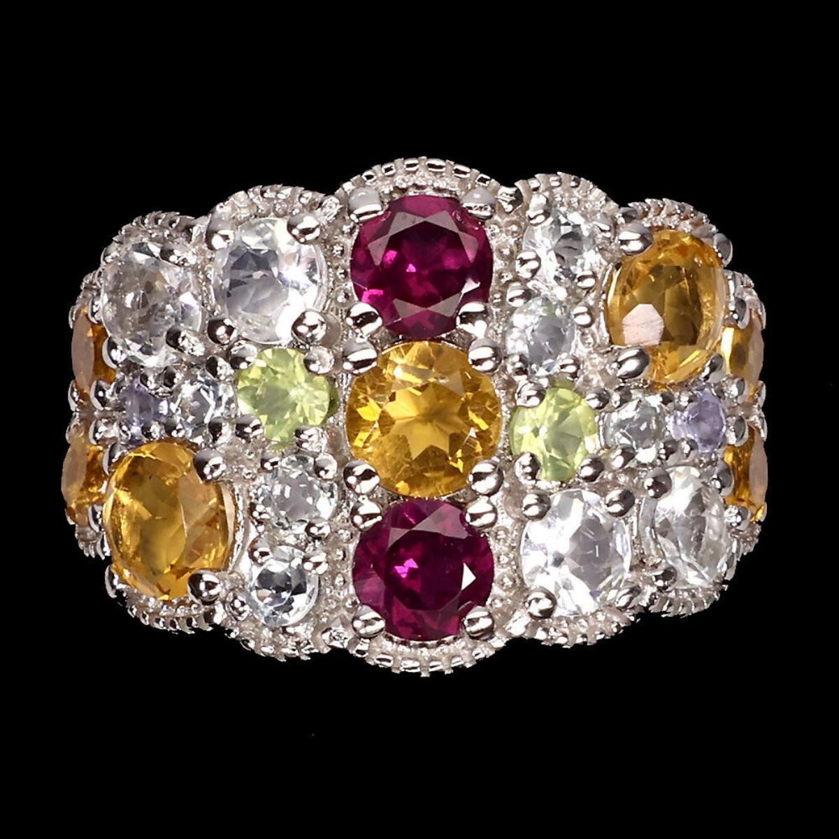 925 STERLING SILVER;PLATE-14K WHITE GOLD;RING SIZE-8(RESIZABLE);MAIN STONE-CITRINE;OTHER GEMS-AQUAMARINE, PERIDOT, RHODOLITE GARNET;TOTAL WEIGHT-6.59 GRAM (TOTAL WEIGHT OF SILVER + STONE);DIMENSION-* STONE 2.0 TO 5.0 MM * RING SIZE 8.0* FACE RING 25.0 X 17.0 MM.;MAIN STONE SHAPE-ROUND;MAIN STONE COLOR- YELLOW;CLARITY/GRADE-IF TO VVS;TREATMENT-UNHEATED;ORIGIN-BRAZIL;HARDNESS-7;