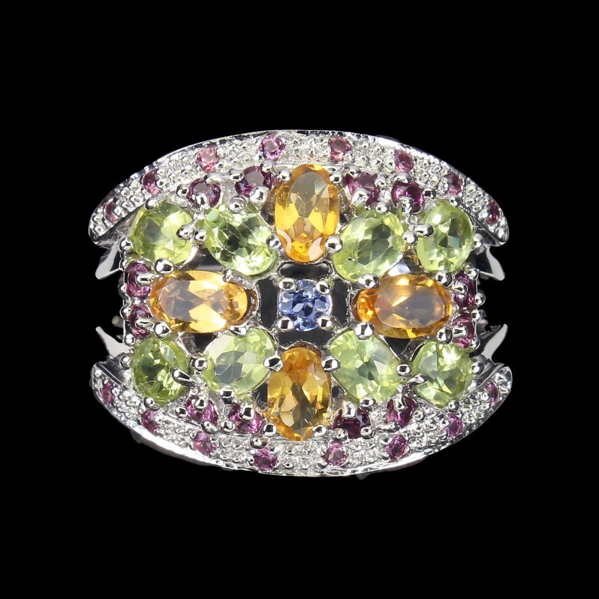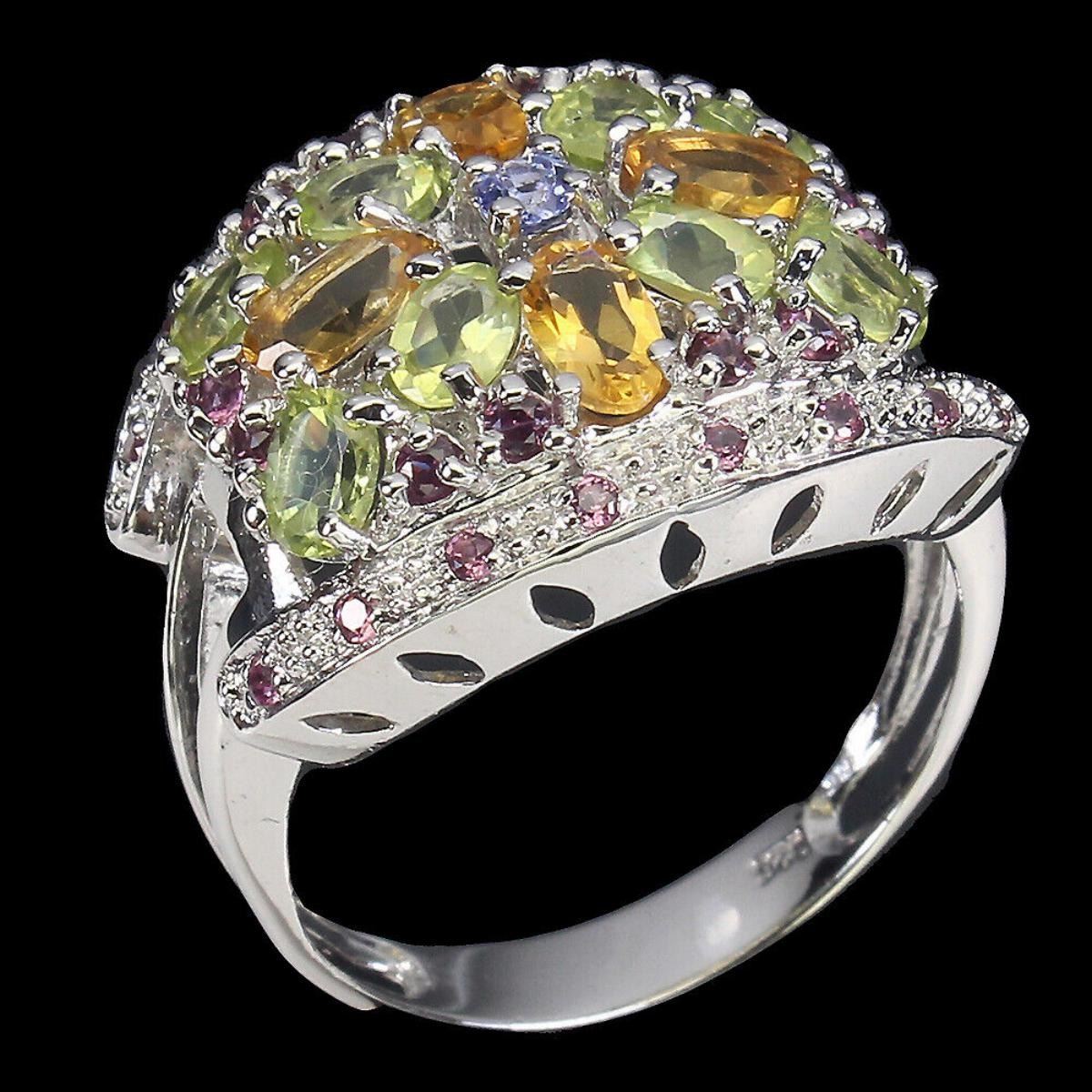 925 STERLING SILVER;PLATE-14K WHITE GOLD;RING SIZE-8(RESIZABLE);MAIN STONE-CITRINE;OTHER GEMS-PERIDOT, RHODOLITE GARNET, TANZANITE;TOTAL WEIGHT-5.11 GRAM (TOTAL WEIGHT OF SILVER + STONE);DIMENSION-* STONE 1.0 TO 5.0 X 3.0 MM.* RING SIZE 8.0* FACE RING 22.0 X 17.0 MM.;MAIN STONE SHAPE-OVAL; MAIN STONE COLOR-YELLOW;CLARITY/GRADE-IF TO VVS;TREATMENT-UNHEATED;ORIGIN-BRAZIL;HARDNESS-7;