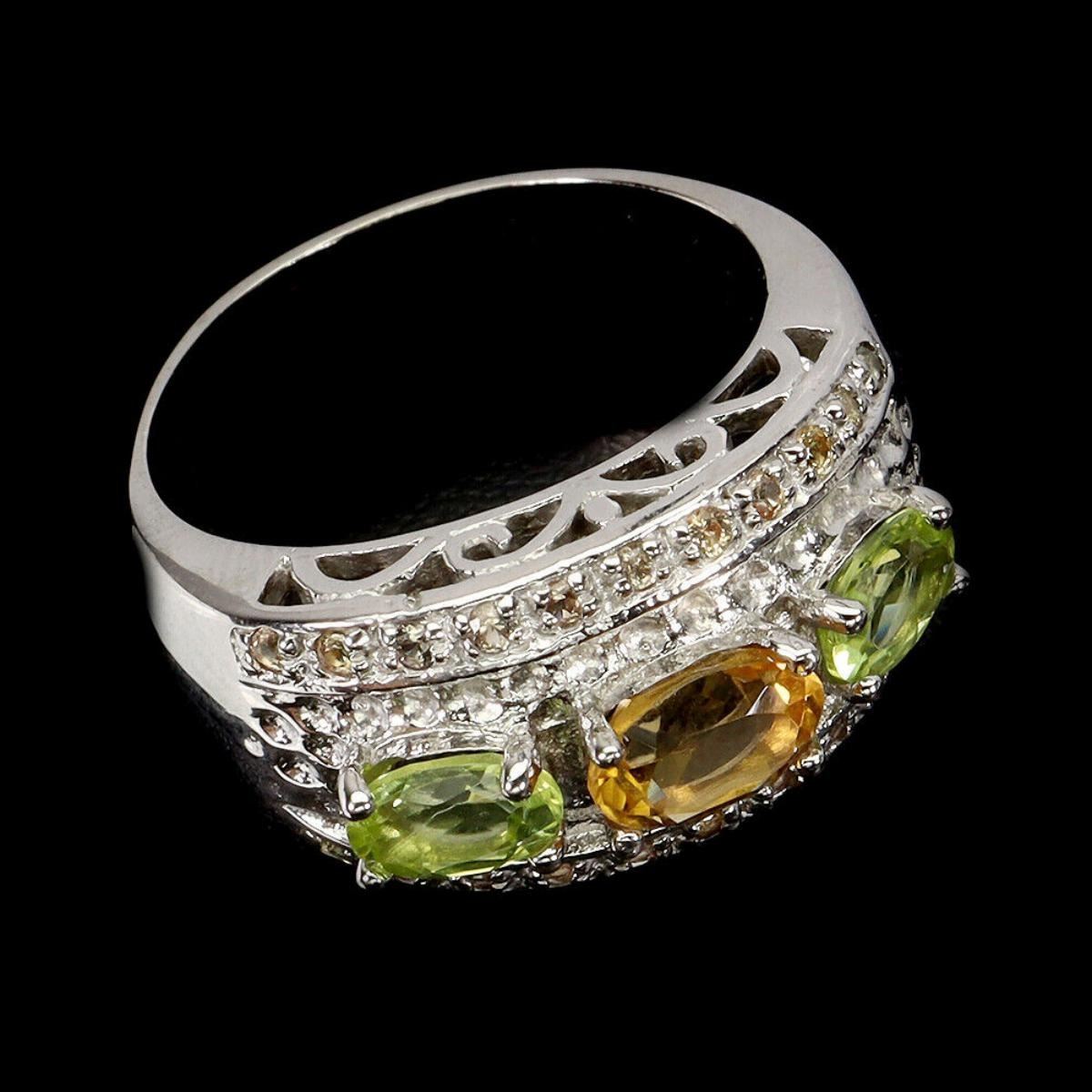 925 STERLING SILVER;PLATE-14K WHITE GOLD;RING SIZE-8(RESIZABLE);MAIN STONE-CITRINE;OTHER GEMS-PERIDOT, SAPPHIRE;TOTAL WEIGHT-7.6 GRAM (TOTAL WEIGHT OF SILVER + STONE);DIMENSION-* STONE 1.0 TO 7.0 X 5.0 MM. * RING SIZE 8.0 * FACE RING 22.0 X 12.0 MM.;MAIN STONE SHAPE-OVAL; MAIN STONE COLOR-YELLOW;CLARITY/GRADE-IF;TREATMENT-UNHEATED;ORIGIN-BRAZIL;HARDNESS-7;