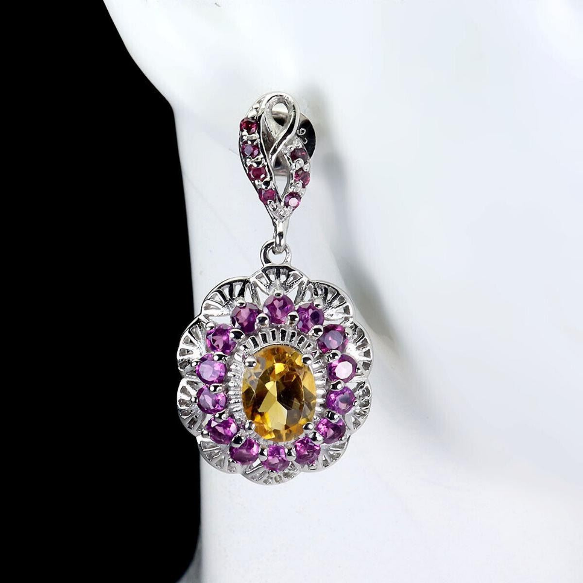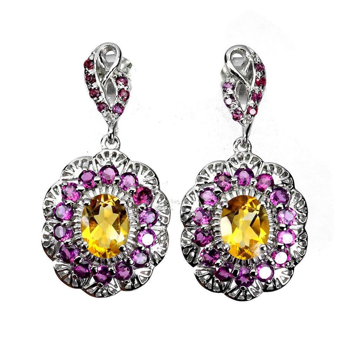925 STERLING SILVER;PLATE-14K WHITE GOLD;MAIN STONE-CITRINE;OTHER GEMS-RHODOLITE GARNET;TOTAL WEIGHT-6.82 GRAM (TOTAL WEIGHT OF SILVER + STONE);DIMENSION-* STONE 1.5 TO 8.0 X 6.0 MM.* FACE EARRINGS 34.0 X 17.0 MM.;MAIN STONE SHAPE-OVAL;MAIN STONE COLOR-YELLOW;CLARITY/GRADE-IF TO VVS;TREATMENT-UNHEATED;ORIGIN-BRAZIL;HARDNESS-7;