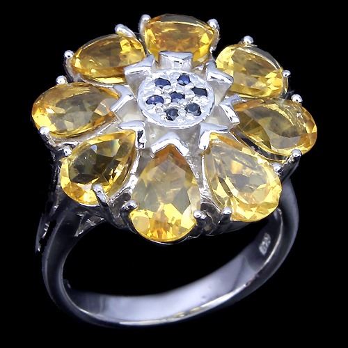CITRINE SAPPHIRE (NATURAL) 14K WHITE GOLD COATING 925 SILVER RINGUNIT OF ITEM (S):1 PIECEWEIGHT (CT.):43.60 CT. (total weight of silver + stone)DIMENSION:* STONE 1.0 TO 7.0 X 5.0 MM. * RING SIZE 7.0; * FACE RING 20.0 MM.SHAPE/CUT:PEAR ROUND FACETCOLOR:TOP RICH YELLOW TOP DEEP BLUECLARITY/GRADE:IF TO VVS OPAQUELUSTER:ELEGANTTREATMENT:UNHEATED HEATEDORIGIN:BRAZIL AFRICAHARDNESS:7.0 - 9.0