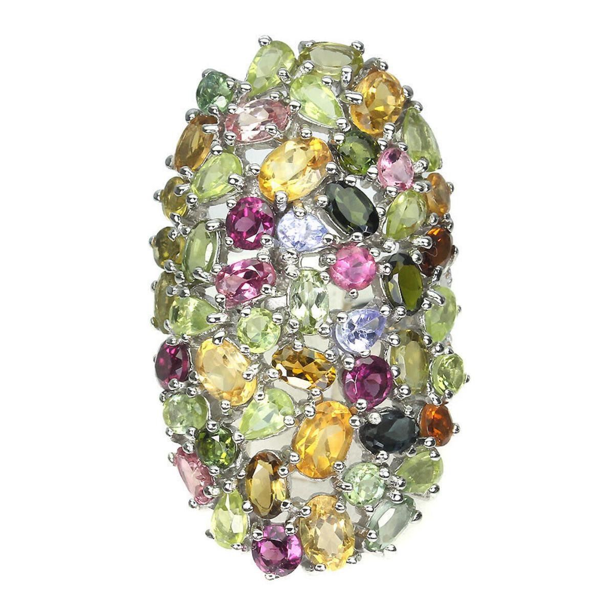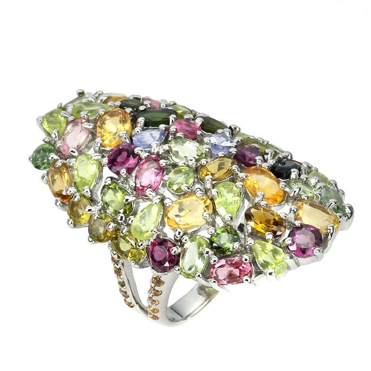 925 STERLING SILVER;PLATE-14K WHITE GOLD;RING SIZE-9(RESIZABLE);MAIN STONE-CITRINE;OTHER GEMS-PERIDOT, SAPPHIRE, TANZANITE, TOURMALINE;TOTAL WEIGHT-12.95 GRAM (TOTAL WEIGHT OF SILVER + STONE);DIMENSION-* STONE 1.5 TO 6.0 X 4.0 MM. * RING SIZE 9.0 * FACE RING 43.0 X 24.0 MM.;MAIN STONE SHAPE-OVAL ;MAIN STONE COLOR-YELLOW;CLARITY/GRADE-IF TO VVS;TREATMENT-UNHEATED;ORIGIN-BRAZIL;HARDNESS-7;