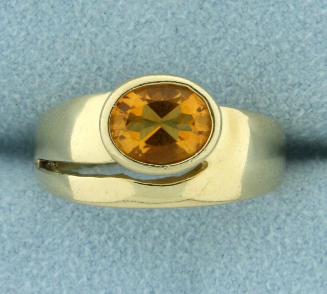 in 14k yellow gold. Contains one oval shaped 1.5ct natural citrine gemstone with excellent clarity and desirable orange/yellow color. Size 7 1/2. 6.7g.