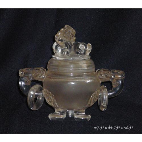 This natural crystal decor is in oriental Chinese incense burner ding shape. There are fu-dog heads carved on the lid, shoulder of two ears and body. It is a charming decoration and collectible piece with its artistic beauty and the craftsmanship. <p>