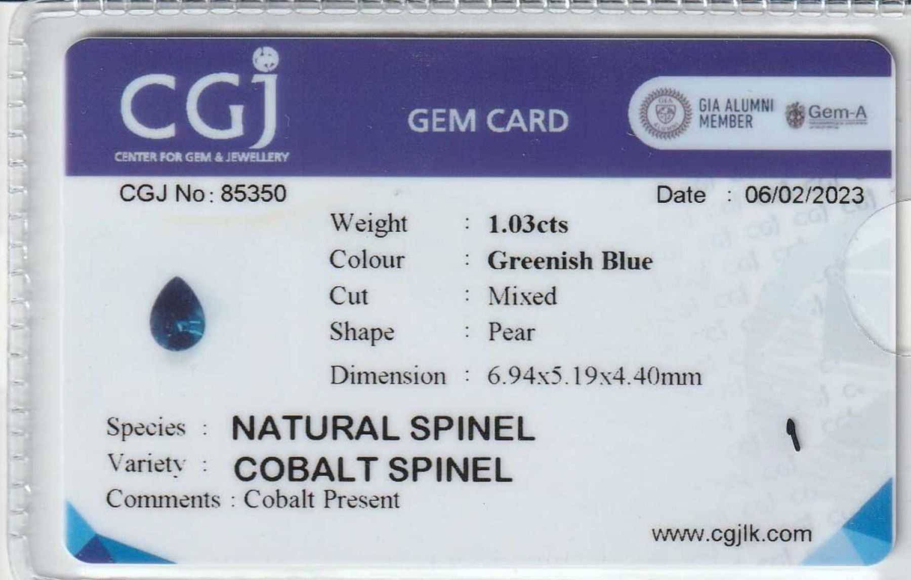 Natural Cobalt Blue Spinel 1.03 Cts - Untreated....Certified. Pear shape---eye clean; Size - 6.94 x 5.19 x 4.40 MM; Origin - Vietnam;