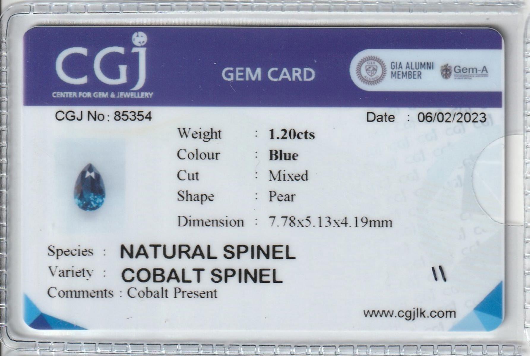 Natural Cobalt Blue Spinel 1.20 Cts - Untreated....Certified. Pear shape---eye clean; Size - 7.78x 5.13 MM; Origin - Vietnam;