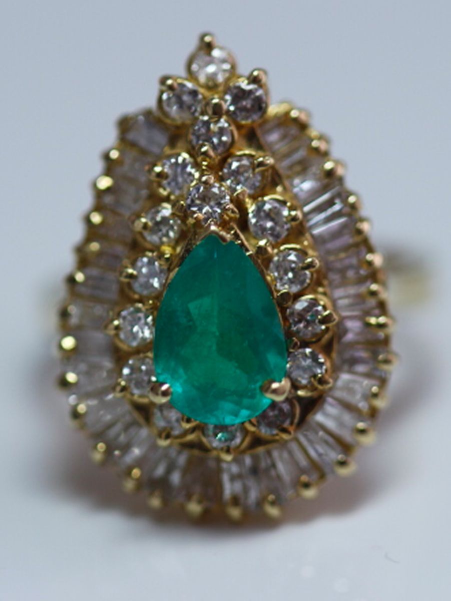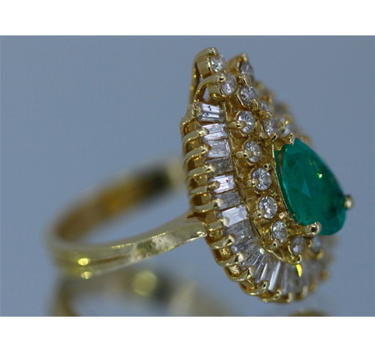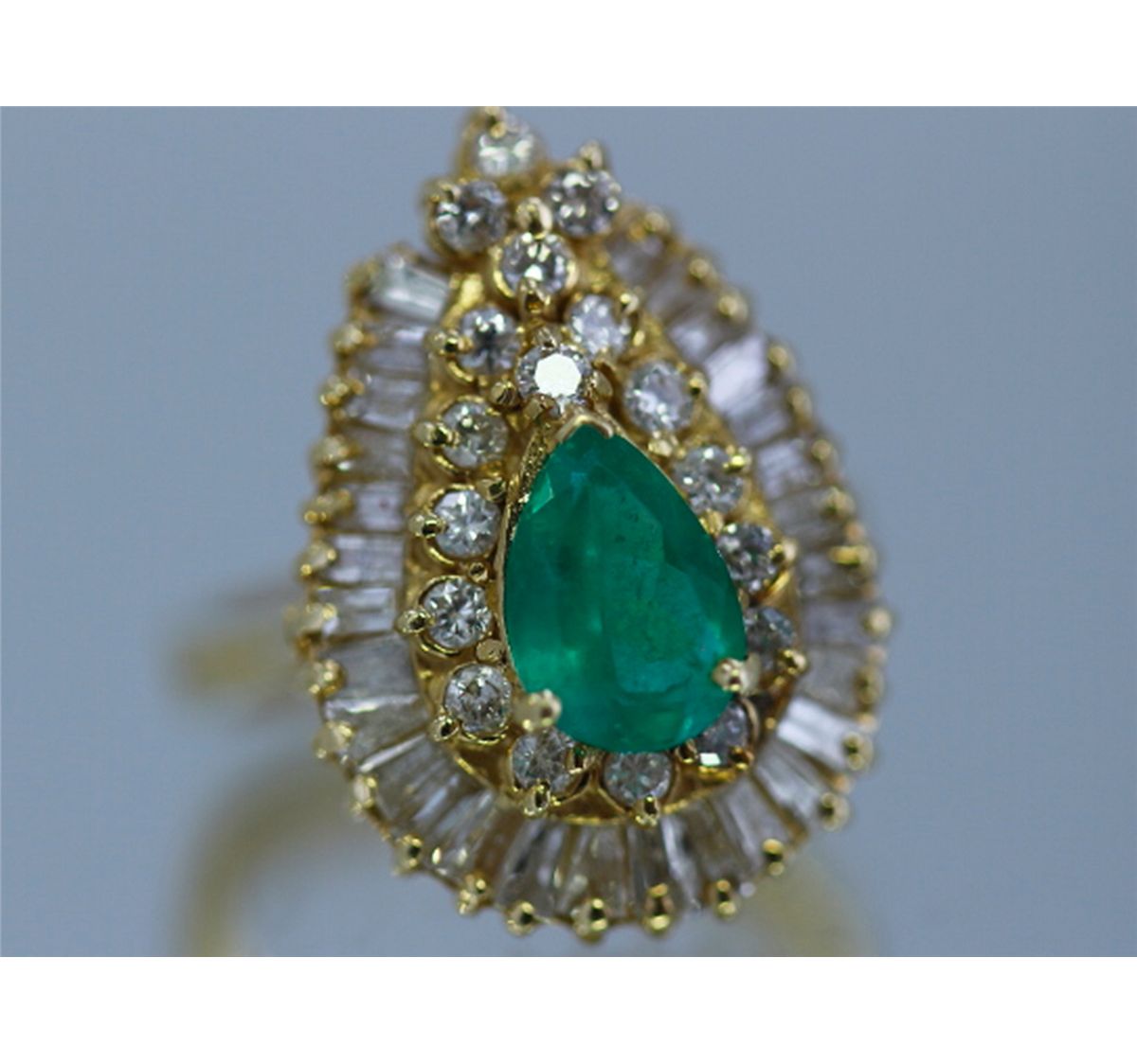 14k Yellow Gold Balerina Style Pear shape Colombian Emerald 2.00ct, 3.00cttw mix shape Diamond, Circa 1980's