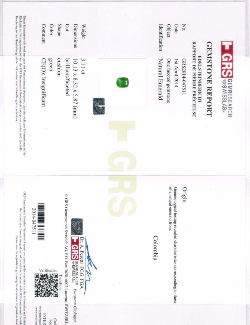Natural Columbian Emerald 3.11 Carats - intense Green color...GRS certified.